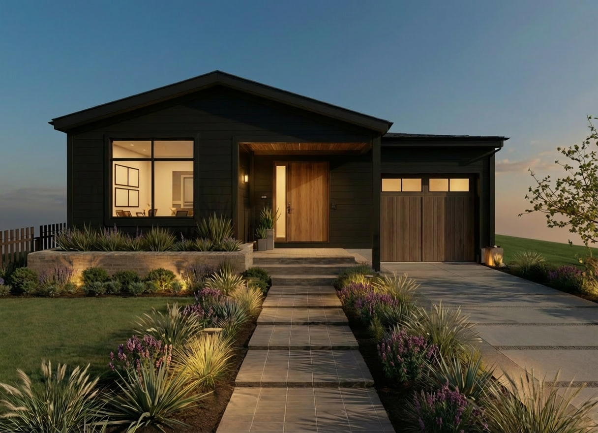 maintain the current image and features and create a late dusk version of this same image utilize subtle warm interior and landscape lighting
