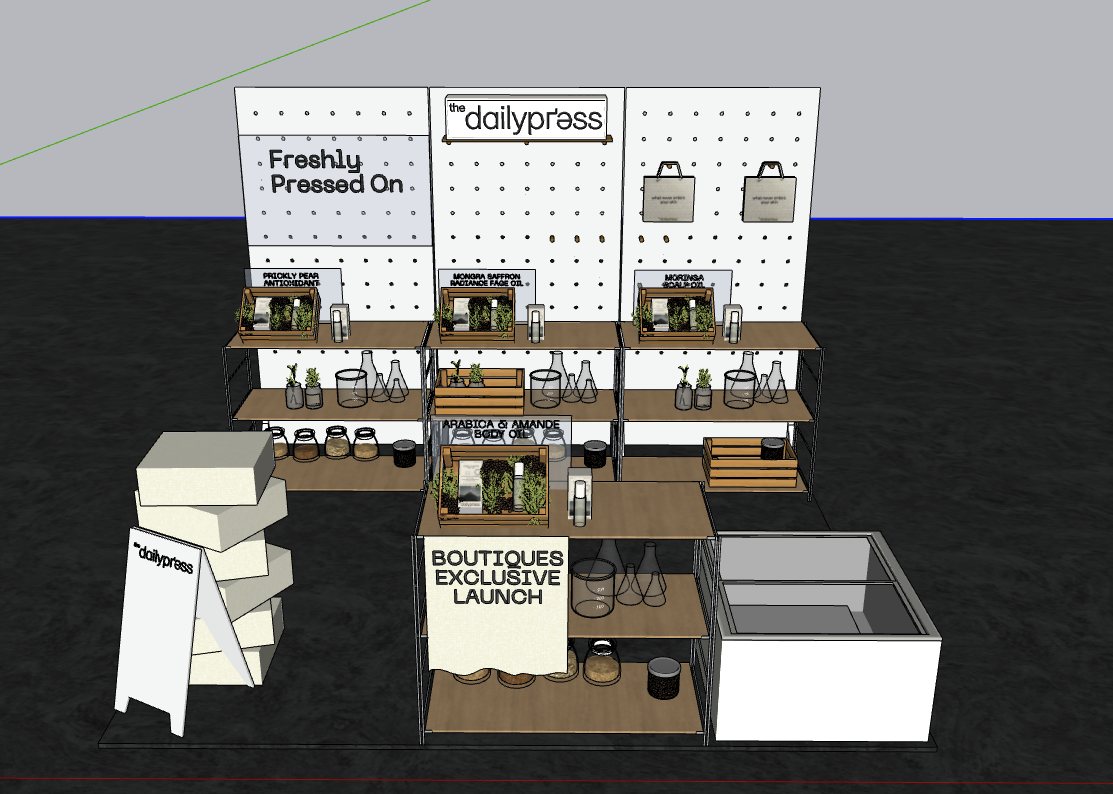 an indoor popup display booth realistic lighting with lightbox logo at the top in the middle warm colours