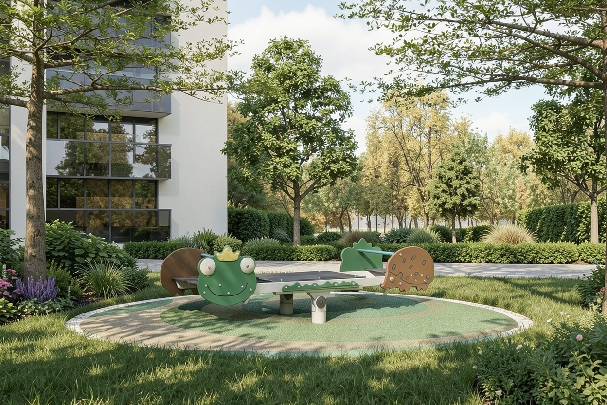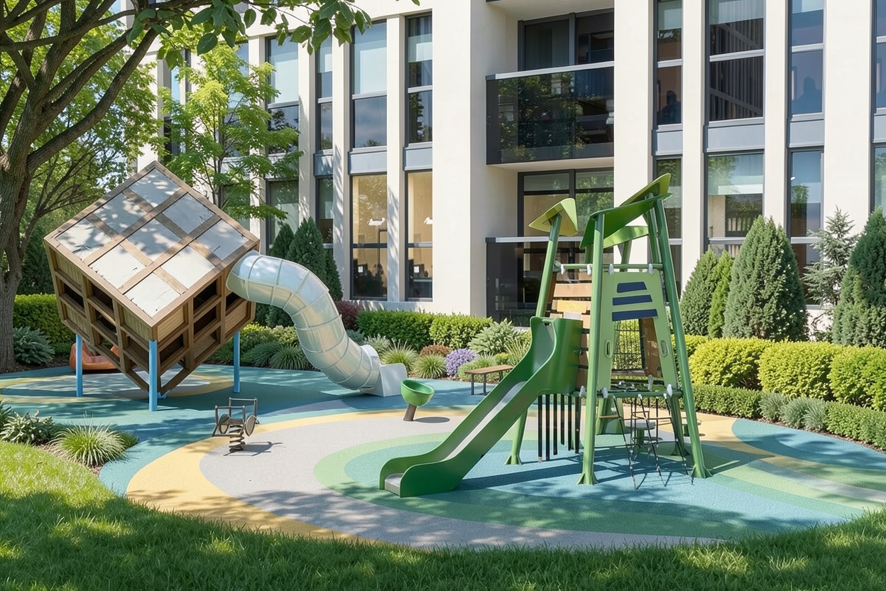 don t change the ground playground epdm colour do not change the original playground layout or angles the setting should remain clearly indoor under condominiun basement with ceiling well maintained landscaping including mature trees layered shrubs shrubs and hedges should form a boundary separating the playground from adjacent areas the ground treatment around the playground should consist of well kept grass and appropriate outdoor safety surfacing blending naturally into the surrounding lawn and landscape at the left handside is tennis court add realism
