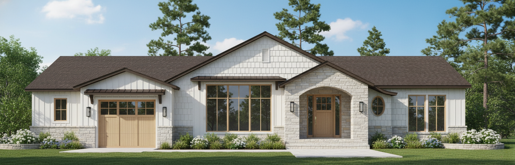 dark roof and soffit white shake where drawn and board and batten light stone white vent light tan window mullions stained white oak front door and garage door black framed exterior lights tall southern pines behind the house garage sticks out farther than the rest of the house following drawing exactly