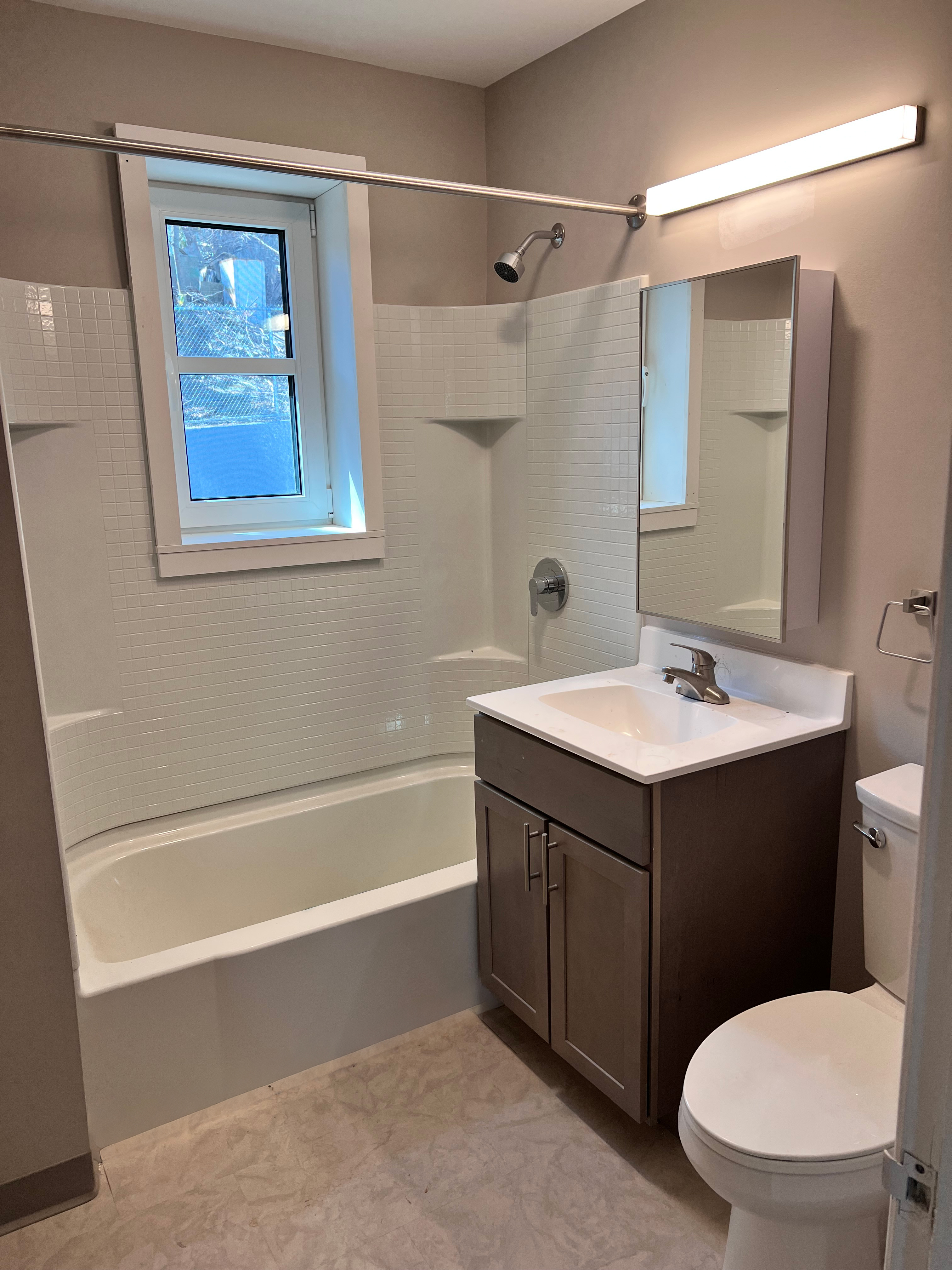 add neutral shower curtain stacked on left side so view inside shower can still be seen