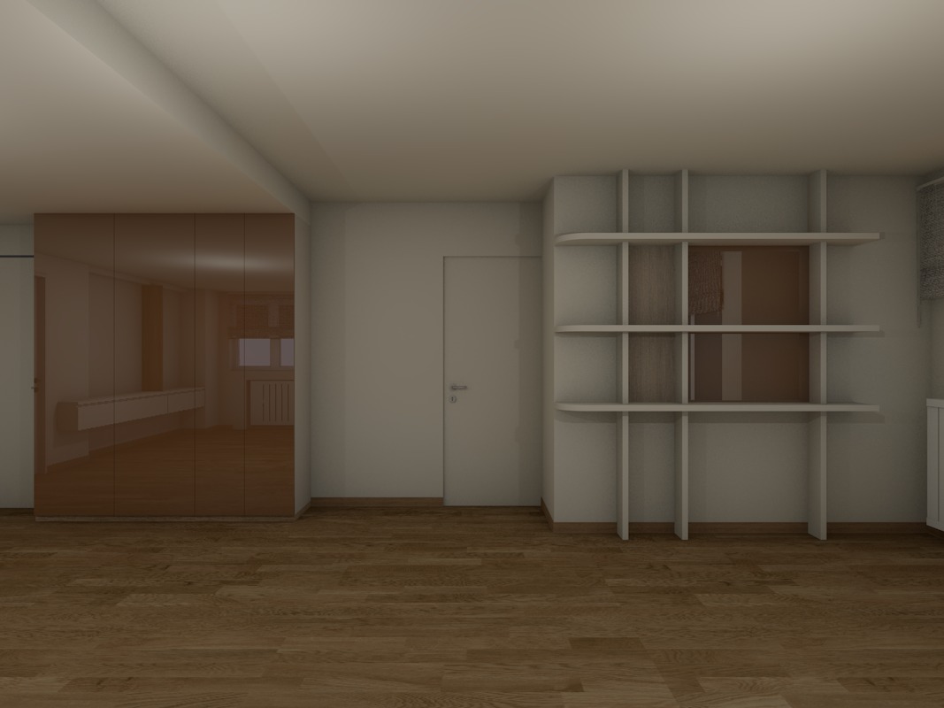 contemporary minimal interior frontal view refined and high end atmosphere on the left side there is a built in wardrobe with full height doors finished in bronze tinted mirror glass smoked bronze mirror the surface is reflective with a warm bronze tone creating depth and a luxurious elegant appearance in the center there is a minimal flat door in a neutral light beige tone with clean lines and no visible detailing maintaining the minimal aesthetic on the right side there is a custom built open shelving unit designed to function as a bar area the structure is minimal in a light neutral tone with clean vertical and horizontal divisions within the shelving composition there are sections finished in bronze mirror and sections in wood exactly as shown in the reference image creating contrast and visual depth the shelves remain empty emphasizing a clean and architectural aesthetic the flooring is natural oak in a soft even tone with a smooth matte finish creating a calm and uniform base materials throughout the space are warm and natural with soft matte wall finishes natural wood textures and reflective bronze glass surfaces lighting soft warm ambient lighting that enhances the bronze reflections and creates a cozy upscale atmosphere overall mood elegant contemporary luxury interior with a clean curated aesthetic high material quality and a sense of understated sophistication camera frontal view eye level high realism soft shadows balanced lighting