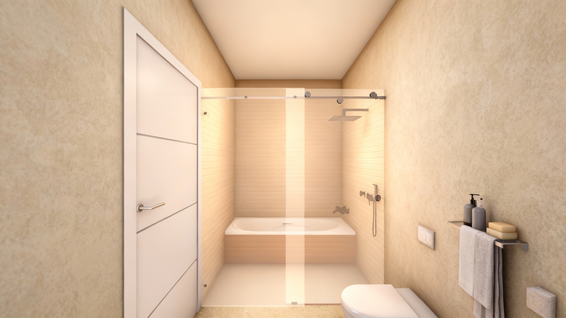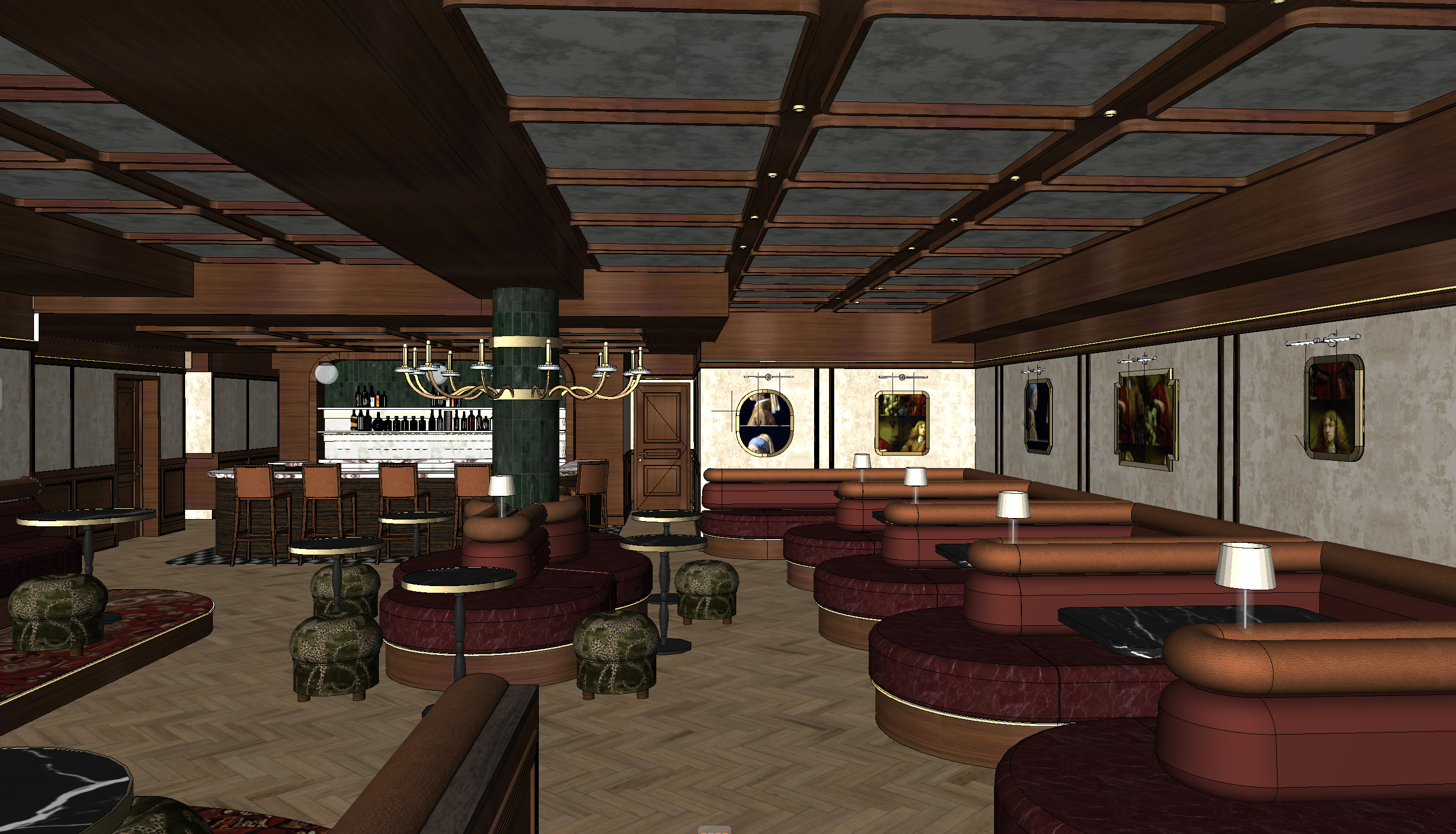 ultra realistic render of the roomservice restaurant main dining room keeping the exact camera angle and geometry deep aged oak ceilings with illuminated coffer panels and antique mirror insets warm 2700k led strip lighting running continuously along the upper wall line and beneath the ceiling band vintage plaster walls with bottle green vertical stripes and classic picture lights highlighting the framed artwork banquettes in burgundy leather with caramel leather backrests soft led underlighting along the curved platforms black calacatta marble tables with brass edging velvet patterned ottomans in dark olive tones central green tile column with large sculptural brass chandelier herringbone oak flooring with natural matte finish the bar in the background glows softly viola calacatta marble front illuminated bottle shelves warm ambient bounce add subtle realism faint reflections on polished surfaces soft shadows gentle atmospheric lighting a few neatly arranged empty glasses on the bar and a warm cinematic depth through the room no added clutter just refined hospitality mood with elevated material realism