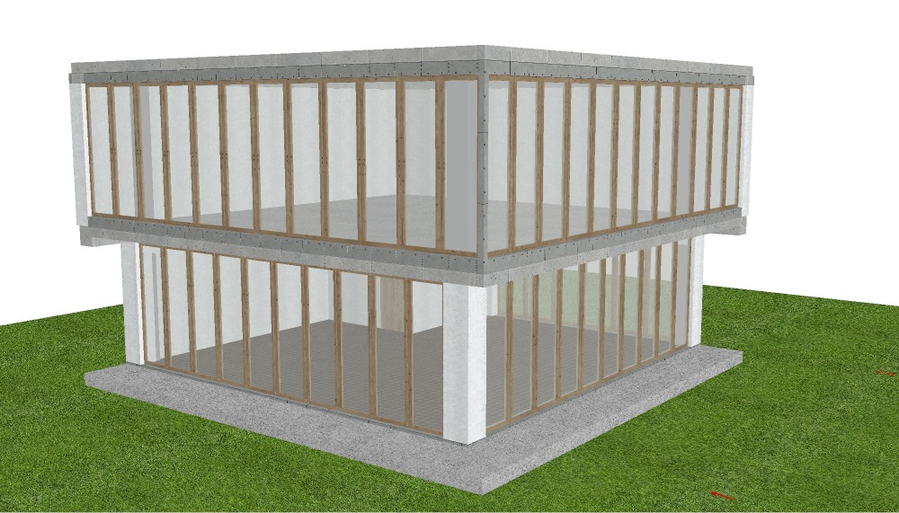 modernist exterior shot a modern two story glass building with wooden window frames featuring soft gray concrete accents the atmosphere is serene and inviting with a bright clear sky above the surrounding lush green grass adds a touch of vibrancy to the scene the building s exterior is illuminated by warm golden sunlight casting gentle elongated shadows across the ground evoking a sense of calm and tranquility architecture