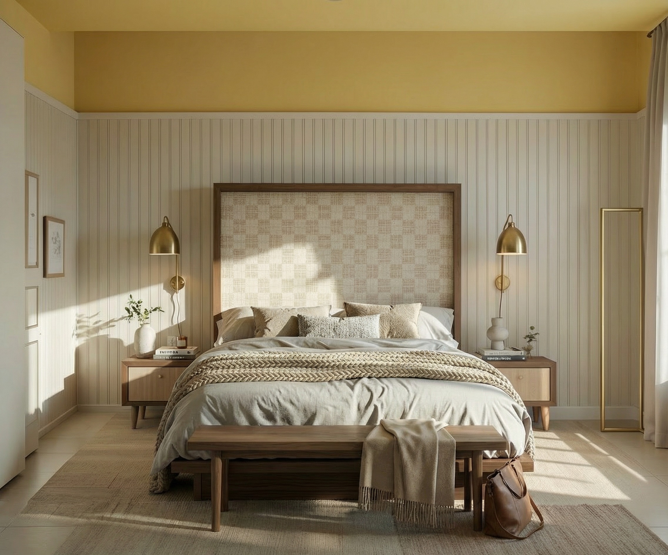 create a refined material mood board derived from this bedroom interior focus on warm creamy neutrals vertical paneling texture light natural oak woven textiles linen bedding aged brass accents and soft morning light tones emphasize tactile materials and layered textures neutral calming organic palette clean grid layout with negative space professional interior design presentation style avoid decorative lifestyle imagery
