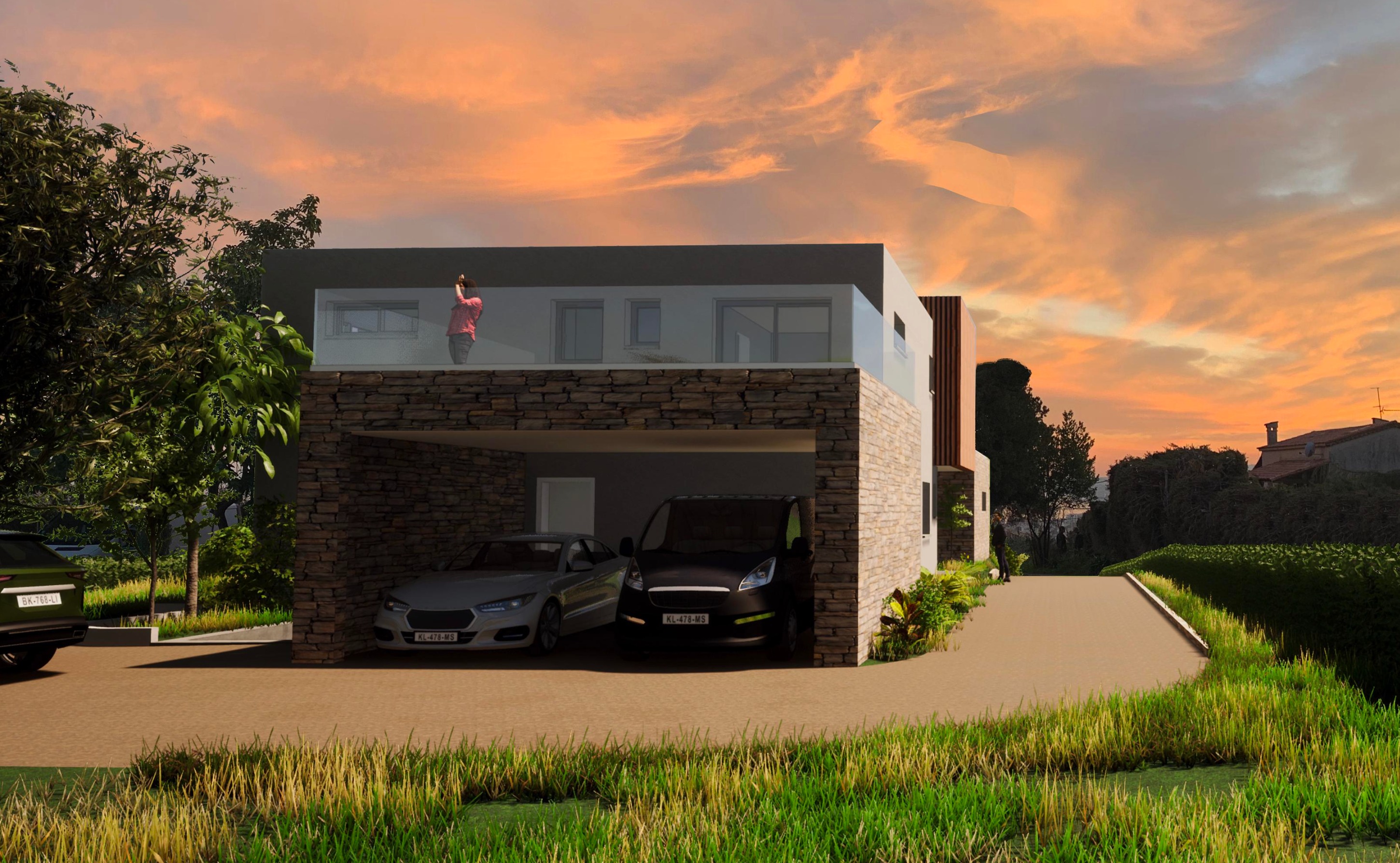 full shot modern house with ultra realistic stacked stone facade textured concrete upper floor glass balcony railing reflecting golden sunlight luxury cars in deep shade garage man standing on terrace holding phone vivid grassy lawn in foreground warm orange sky with soft light shadows extremely detailed surface texture on natural stone subtle imperfections on concrete and reflections on glass balanced composition from front left perspective five adjectives textured realistic immersive warm architectural ultra detailed hyper realistic cinematic lighting fine texture