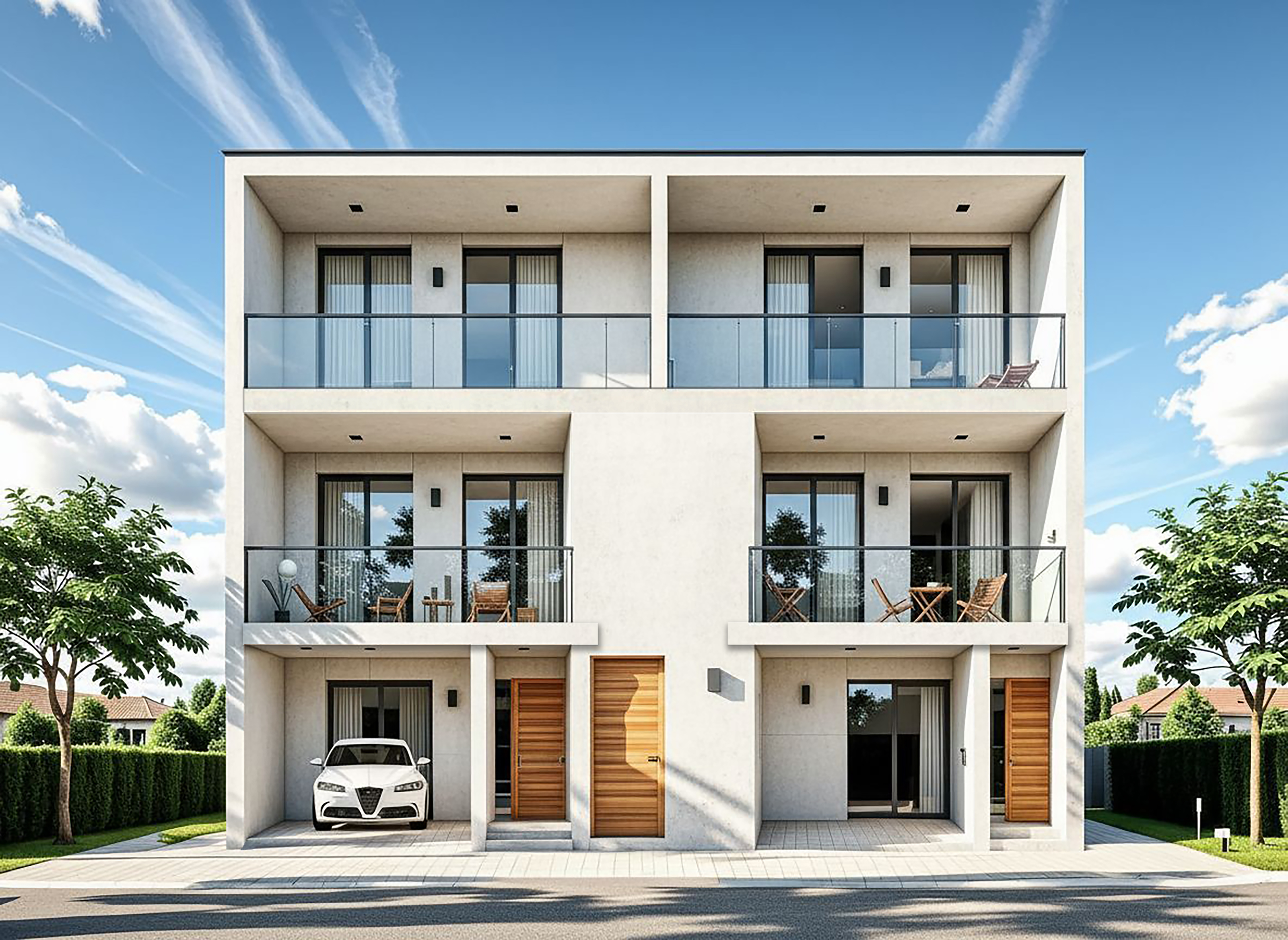 modern exterior shot transforma esta imagen en una fotograf a hiperrealista de arquitectura moderna manteniendo exactamente la composici n original sin alterar formas proporciones ni dise o aumenta el realismo de los materiales hormig n vidrio metal madera piedra etc con texturas de alta fidelidad y reflejos realistas mejora las plantas rboles y vegetaci n haci ndolos m s naturales y con colores vivos y detalle fotogr fico iluminaci n luz natural de d a muy soleado sombras suaves y ambiente c lido estilo fotograf a de arquitectura contempor nea hiperrealista con sensaci n de claridad nitidez y profundidad no cambies ning n elemento ni composici n de la imagen original solo mejora su realismo visual y calidad fotogr fica architecture