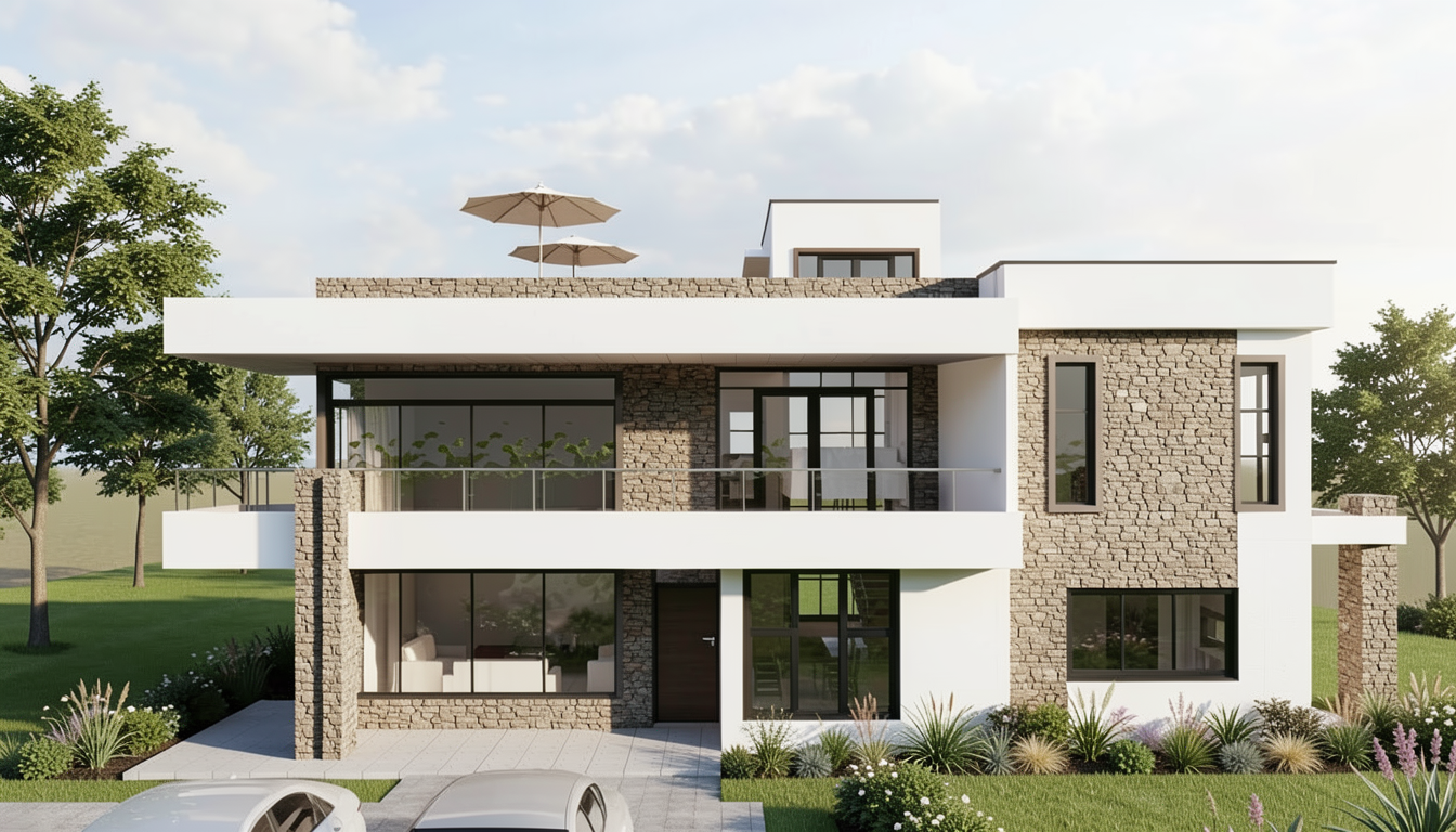 combine the prompts from the first model with the second regarding the bench skylights and floor pattern bring the stair forward in the image and show more of the foyer and less of the great room show the end wall as a wall of windows the side walls with light panelling the stone fireplace should be rendered as the attached image