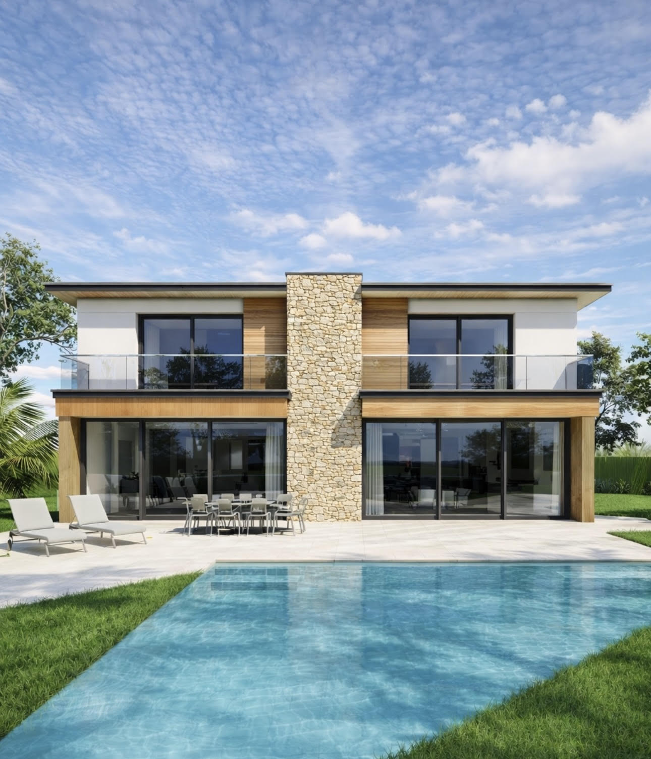 exterior shot respect exactly initial forms and architecture but possible to change materials make it charming with furnitures and accessories