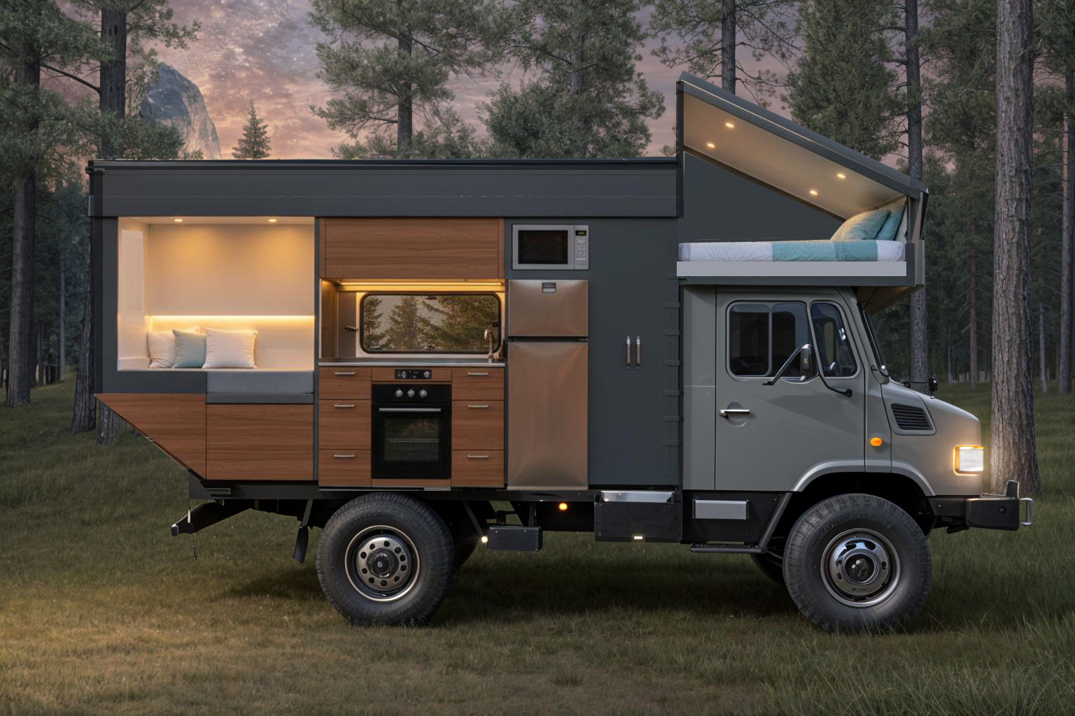 contemporary interior shot create a realistic scene of a green expedition truck with a comfortable interior setup the truck sits amidst a serene forest setting with tall pine trees under a starry sky the vehicle body should be olive green with rugged black tires highlight the cozy interior space with warm soft yellow lighting inside depict gray cushions and a smoothly textured wooden finish for the cabinetry and seating area the environment should be calm and inviting capturing a sense of adventure and tranquility architecture