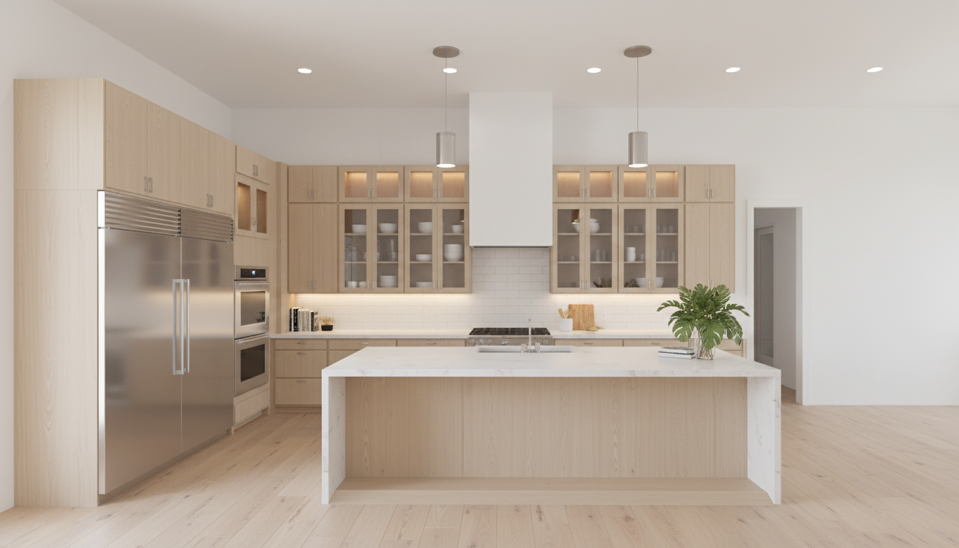 interior shot modern farm house kitchen white oak and glass cab white counter tops under cad lighting to pendants lights over island