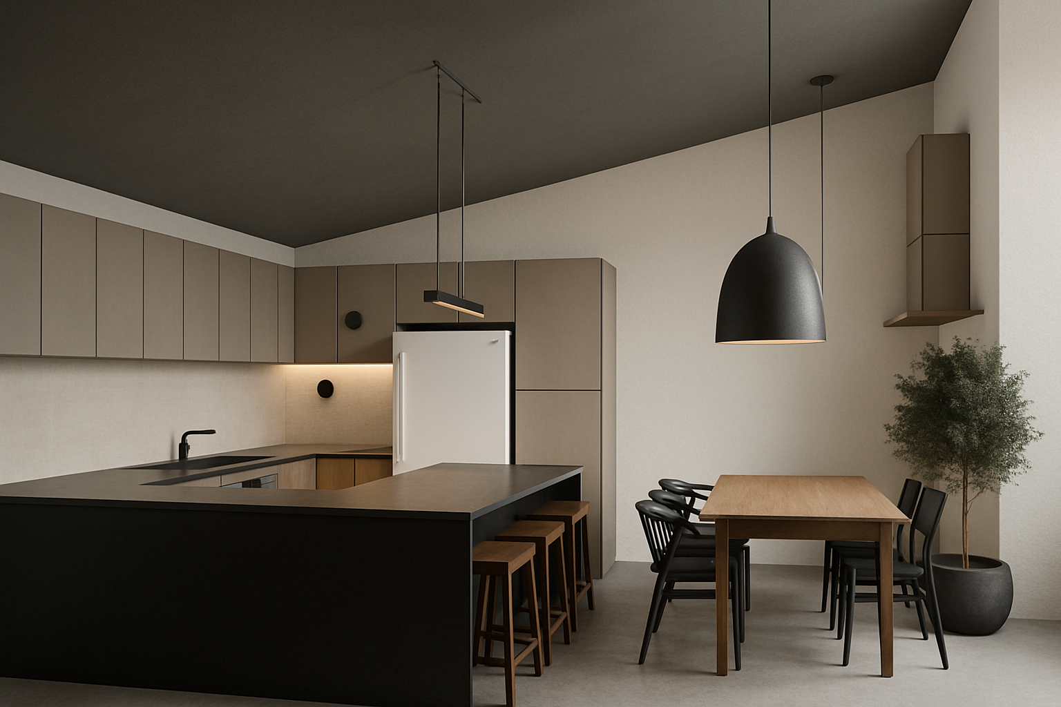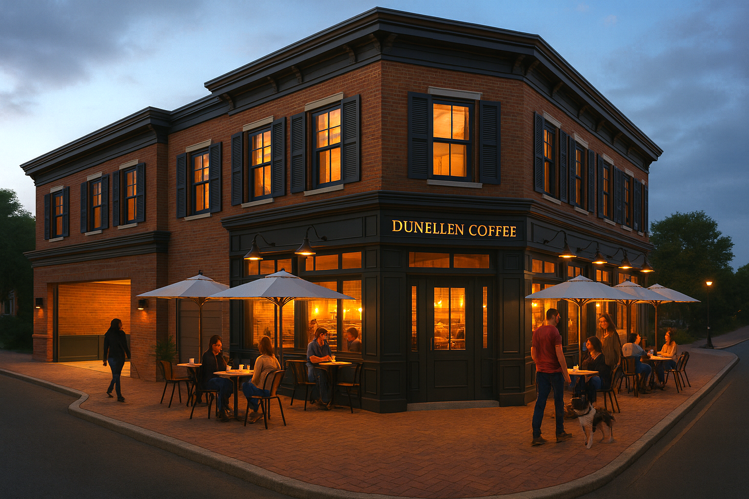 exterior shot a charming corner coffee shop at dusk bathed in warm golden light from the glowing windows the building features elegant dark wood accents and rustic red brick patrons sit at tables under large light gray umbrellas creating a cozy inviting atmosphere the sky is a soft dusky blue with hints of clouds adding to the serene comfortable vibe surroundings are lush with deep green foliage and dimly lit streetlights architecture