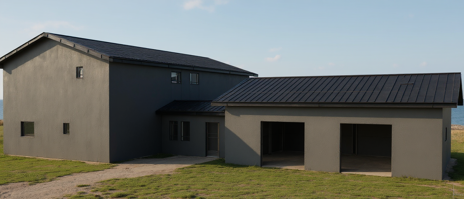 render this 3d image to appear photo realistic maintain all existing architectural materials and structural elements exactly as shown enhance the setting with a lush well maintained landscape include minimal beds manicured shrubs and a tree lined backdrop that frames the home naturally the windows should have a glossy finish with clear reflections of the surrounding trees and sky lighting should feel natural with soft shadows and realistic depth to bring the scene to life