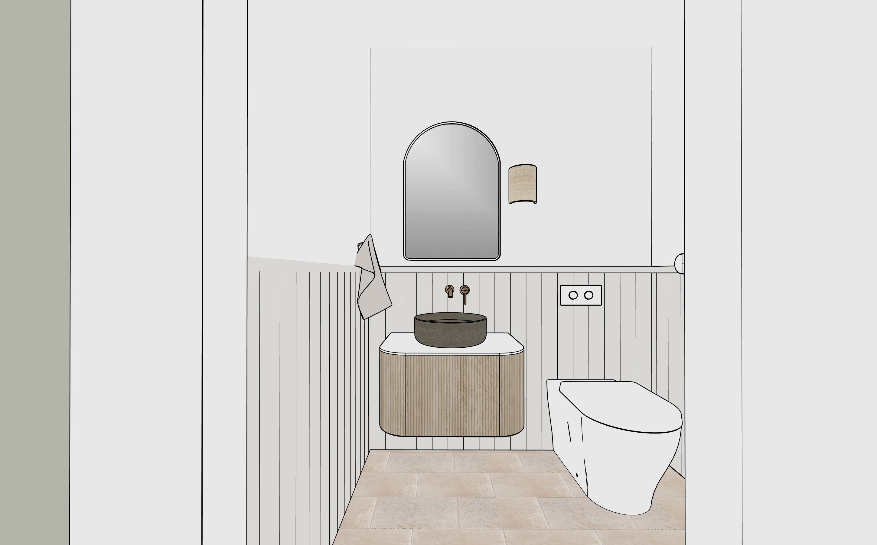 vanity is https www thebluespace com au collections wall hung vanities products ingrain curved fluted wall hung vanity variant 41109834891379 spec sheets in light oak with white stone top vj panelling half height all around 30mm half dowel on top of vj and in a soft beige colour walls above panelling is white no light coming from wall light floor tile this https tilecloud com au products seaforth travertine look beige matt 1 wall light https www beaconlighting com au traviato 2 light up down wall sconce in travertine basin is this in a handmade ceramic finish https www robertgordoninteriors com products clay 350 round hand basin rivergum there is no windows in this room