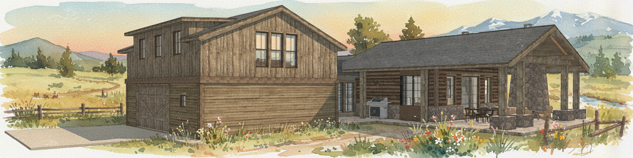 grainy watercolor render of timber frame building with reclaimed wood siding pioneer look like old watercolor in the background extensive watercolor rural and pioneer landscaping surrounding the building sketch