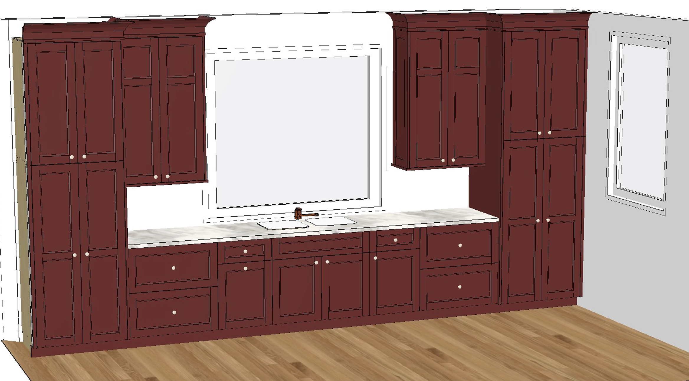cabinet color is sw river rouge show evening glow with a picturesque view out the window with marble countertops and backsplash and brushed gold hardware