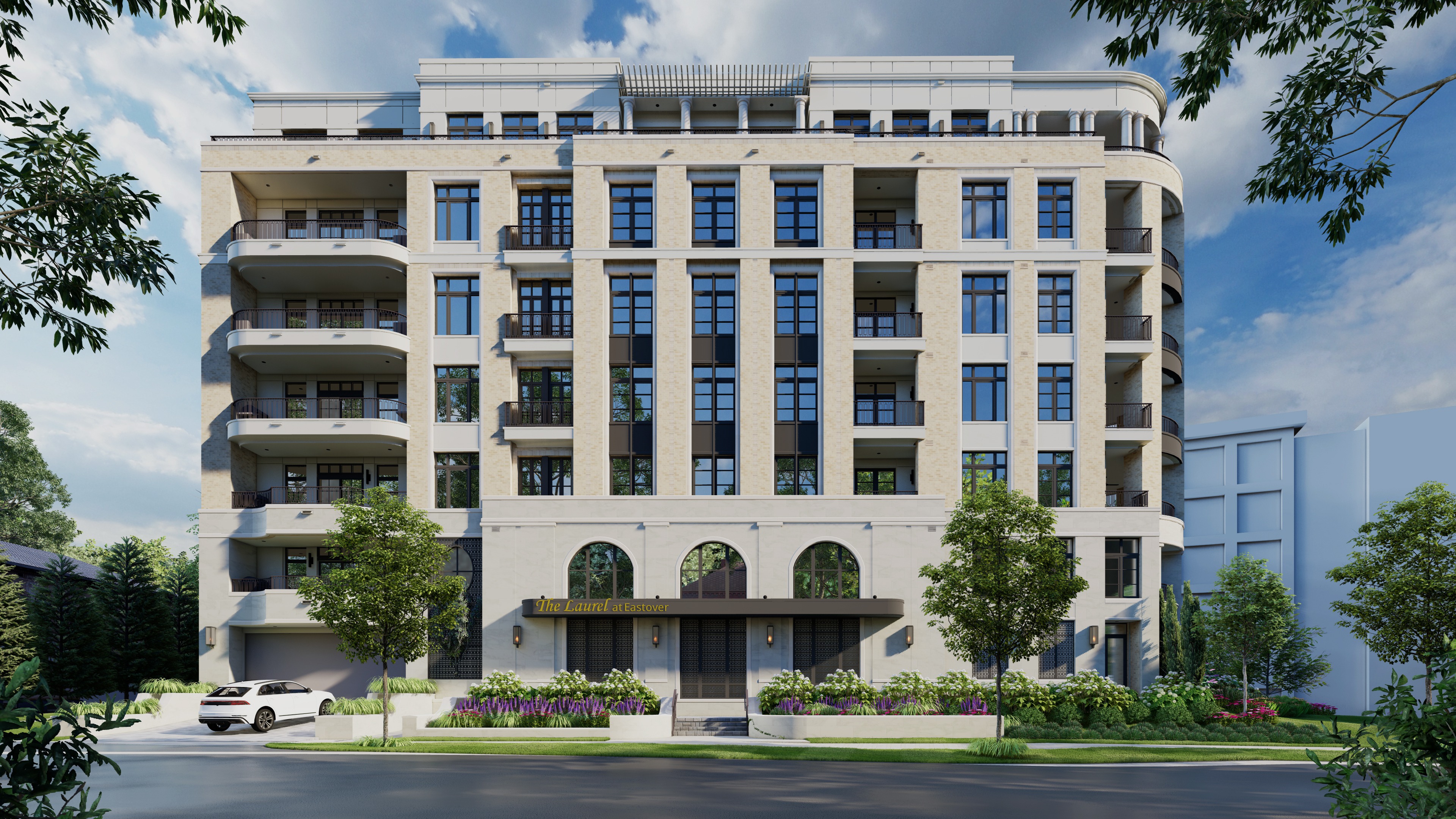active high end condo luxury building rendering improve materials dusk colorful gradient sky landscape lighting true colors