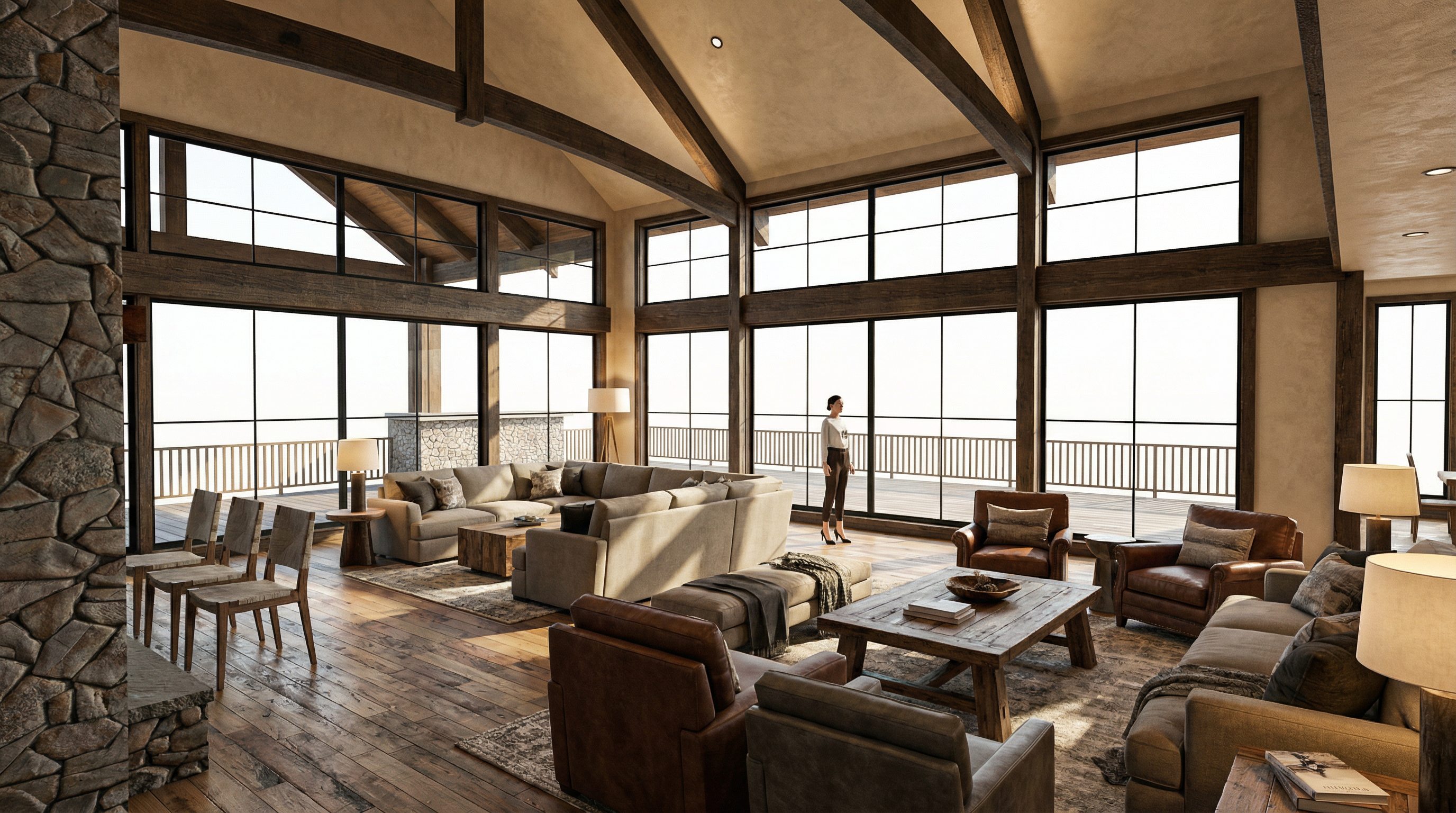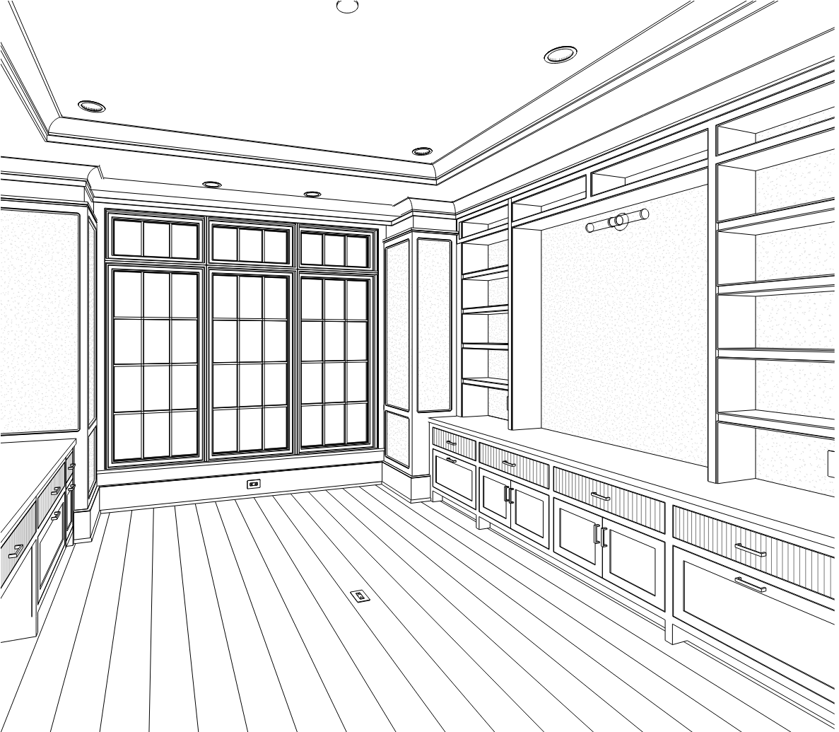 create a realistic view of an office with the same wood finishes add an exterior view that resembles a backyard in massachusetts in the spring add sunlight coming in through the windows turn on the art light in the niche do not add any decorative objects do not change scale shape and layout