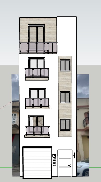 ultra realistic architectural render of the provided image this is a strict image to image material override preserve the exact camera angle composition geometry and all elements do not change viewpoint or proportions primary instruction very important replace the entire facade finish with smooth painted masonry rendered plaster in a warm sand beige color uniform color across all main wall surfaces smooth clean matte finish very subtle fine plaster grain no stone blocks no limestone texture no joints no aging no stains secondary material only where specified apply travertine stone cladding only in these areas balcony feature zones behind balconies and slab bands vertical feature strip if present in the model travertine finish light beige tone soft horizontal veining honed matte finish clean refined not rough important material control 90 of facade must read as smooth painted plaster travertine must be limited and clearly defined no blending between plaster and stone balcony railings clear glass with minimal framing apertures crisp white window and door frames lighting natural daylight soft shadows balanced exposure context keep surrounding buildings exactly as in the original image strict constraints no camera movement no perspective change no reinterpretation of materials critical instruction this is a repainting task not a stone facade enforce smooth painted plaster as the dominant material