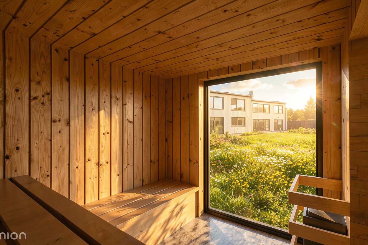 gabled roof house with a mix of blue and gray stone exterior large symmetrical windows and dark wood garage doors the entrance features a classic wooden door with glass the roof is dark gray complementing the stone facade the garden is cleanly landscaped with trimmed bushes and winter trees atmosphere is calm and serene with a bright overcast sky colors include light gray dark gray dark brown and deep green the setting is suburban and elegant