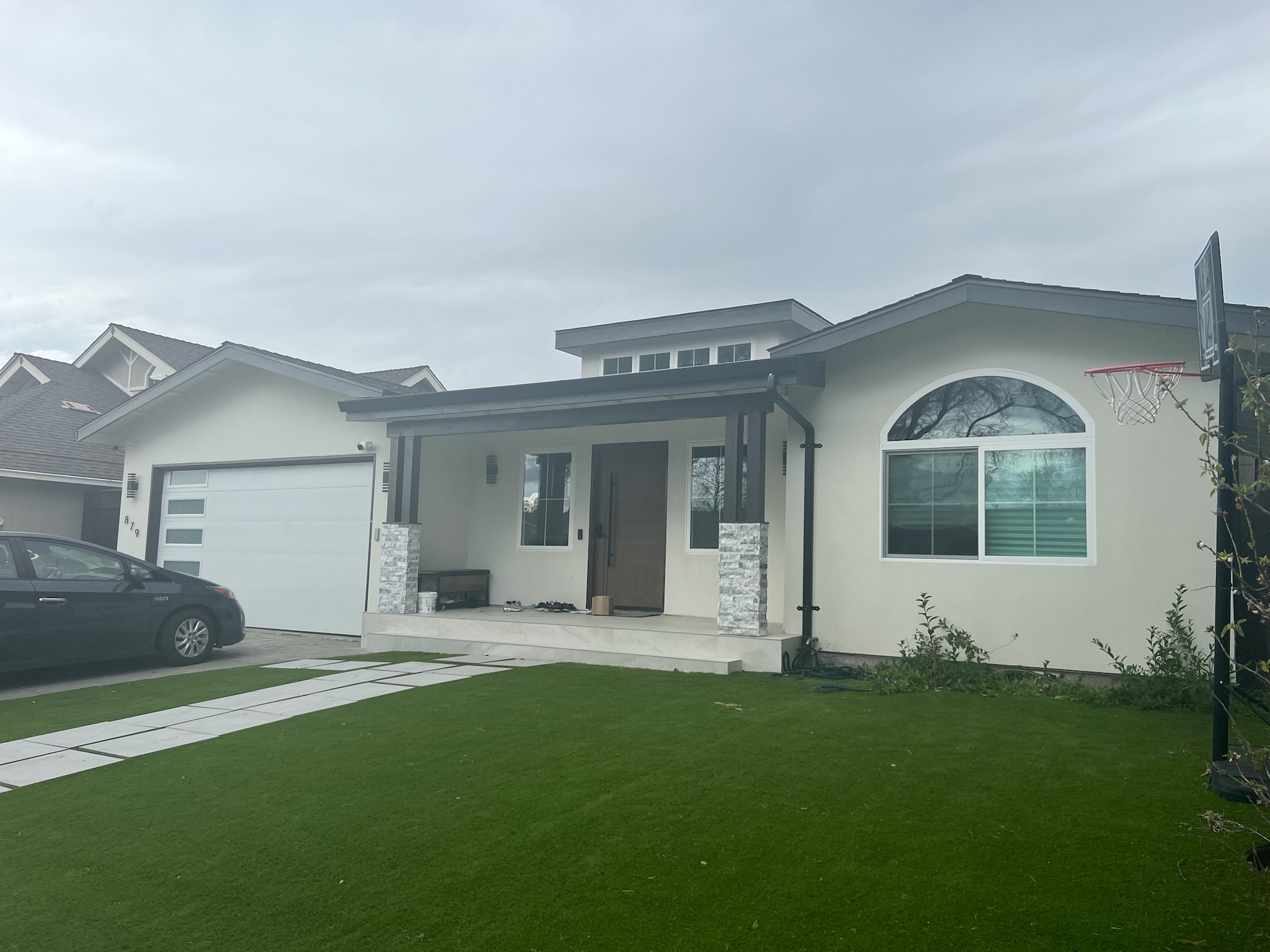 a manicured lawn layered flower beds low maintenance shrubs native plants stone pathway leading to the entrance