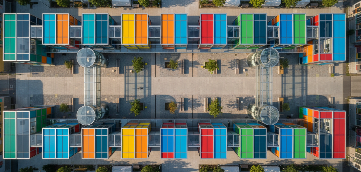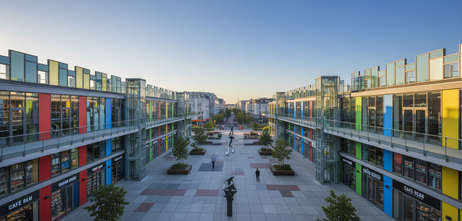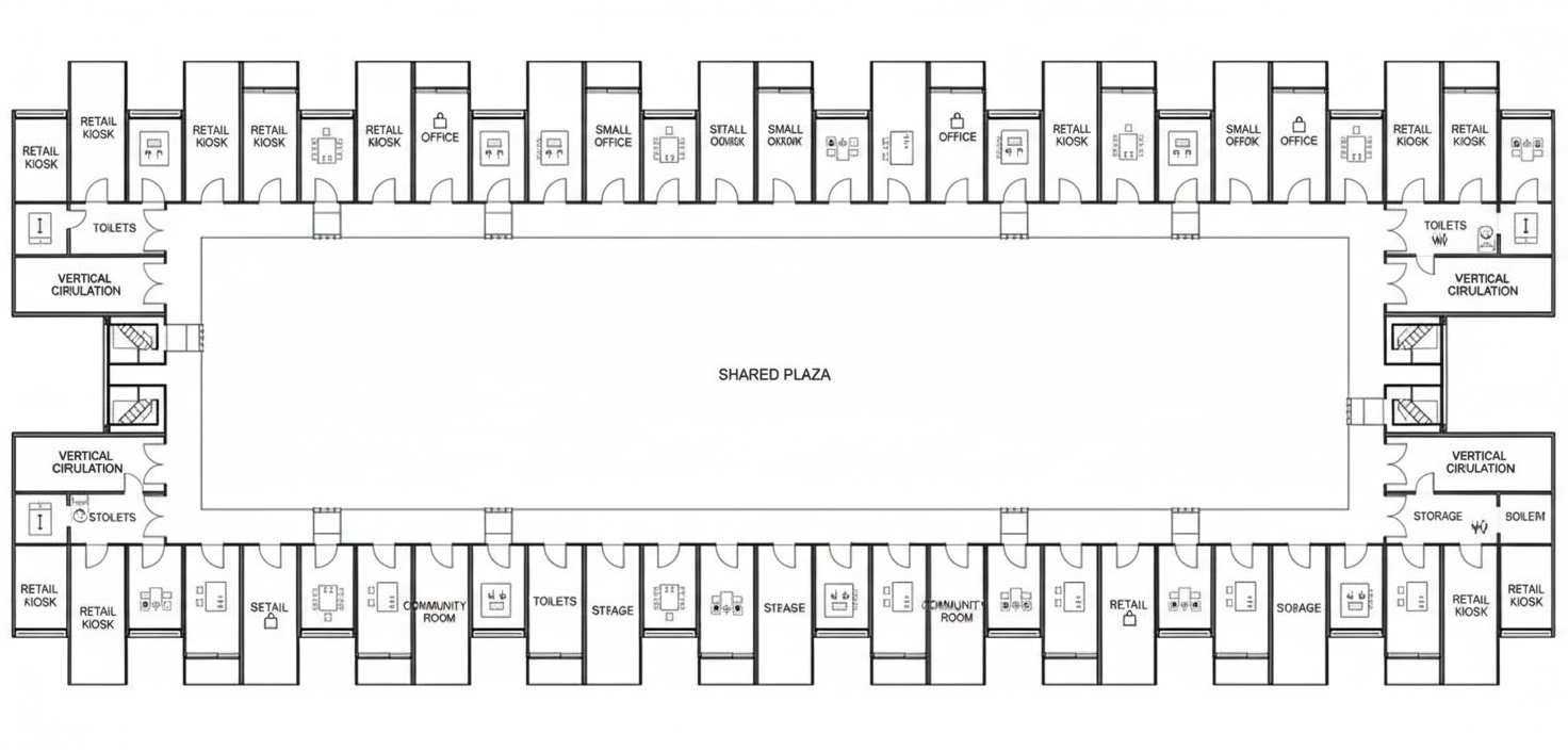 modernist generate a level 1 retail shopping arcade floor plan based on a linear double loaded arcade typology the layout consists of two parallel rows of retail units facing inward onto a central open concourse populate the units with a mixed retail programme as follows allocate 50 of units to fashion and lifestyle retail shops 25 to food beverage tenants including caf s bubble tea kiosks and casual dining 10 to services such as a beauty salon pharmacy and money changer 10 to specialty retail such as a bookstore gift shop and electronics accessories and the remaining 5 to an anchor tenant or convenience store at one end of the arcade label each unit with its programme place f b units with outdoor seating spilling into the central concourse include kiosk placements within the concourse at regular intervals for pop up retail or vending maintain clear pedestrian circulation of at least 4 metres along the concourse centre entrances to the arcade are located at both short ends apply a street level retail zoning logic with active frontages throughout architecture