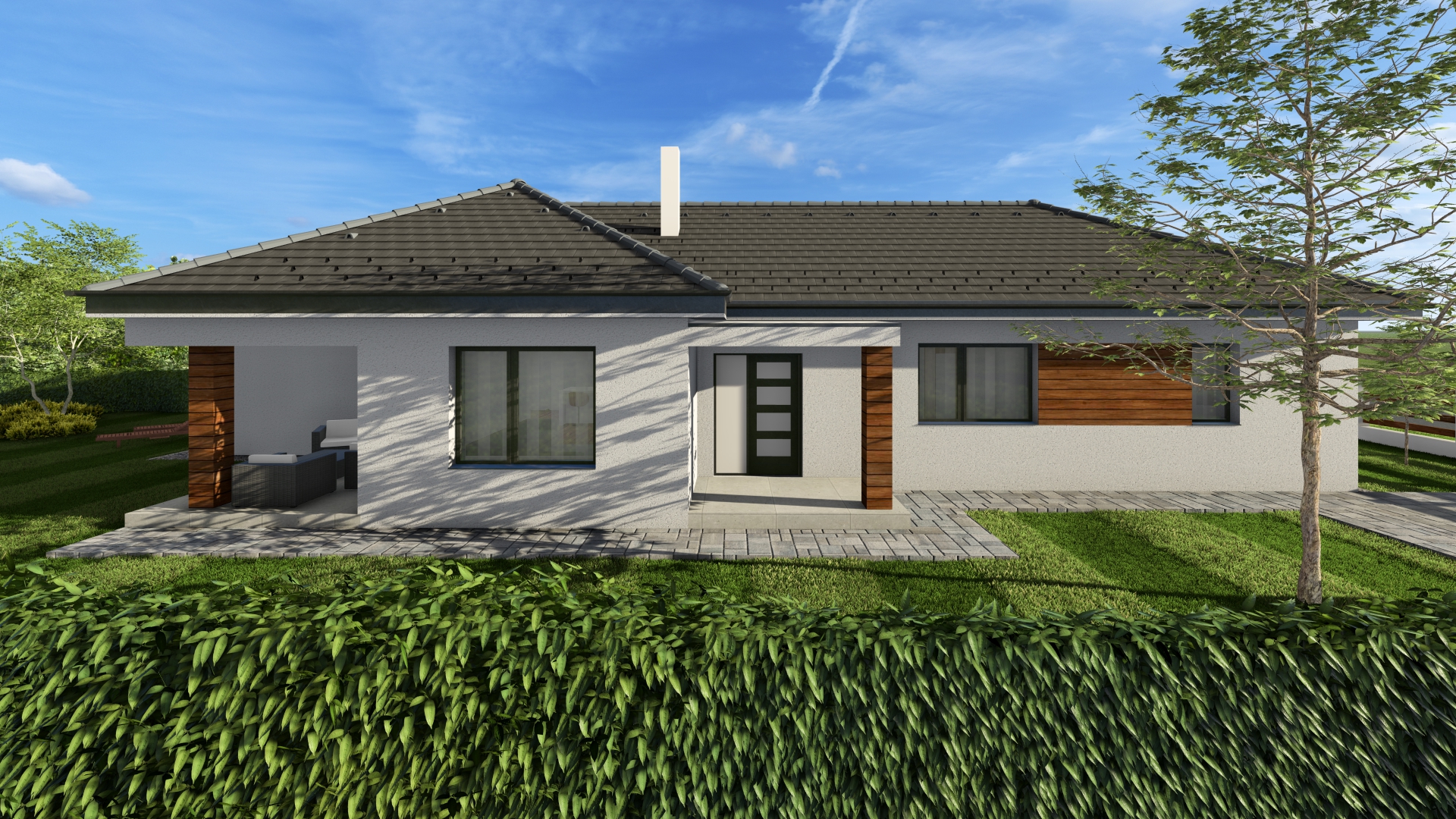 render a photorealistic 3d perspective of this house in a hungary do not change the view keep model geometry the same windows doors roof walls pavement driveway fences facade decor sidewalk hyper realistic 8k cinematic lighting serene atmosphere photorealistic textures realistic reflections reference the current material style just enhance them only enhance the current materials and make the landscape nicer vegetation detailed textures in the wood siding and glass reflections and a vibrant clear sky with light atmospheric depth render in hyper realistic architectural visualization quality 8k resolution roof minimalist anthracite concrete tile facade a mix of smooth white mineral plaster horizontal walnut wood slats windows antracit aluminium minimal fence anthracite colored premium metal mesh landscape professional minimalist garden design green clean cut grass 2 young maple tree prunus laurocerasus whether nice clear early summer in middle europe outside the fence some new family houses natural hungarian great plain native landscape do not add any elements de not change the composition