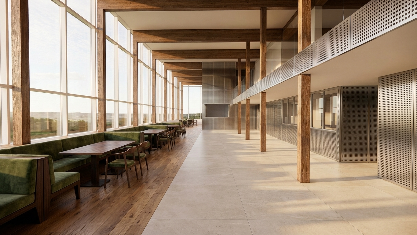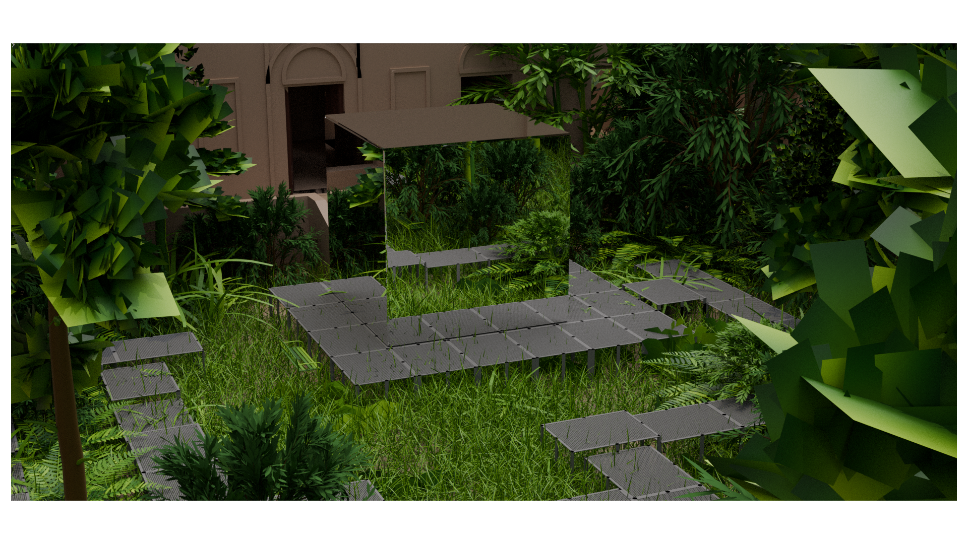 enhance realism of this architectural render while preserving geometry and composition central cube apply semi reflective mirror film material not perfect mirror with subtle roughness variation light diffusion fingerprints micro scratches and slightly blurred reflections of surrounding vegetation walkway matte steel panels slightly elevated above the ground a few centimeters with visible joints soft industrial finish micro surface imperfections light dirt accumulation and soft contact shadows underneath vegetation replace with highly realistic natural vegetation dense wild grass with variation in height thickness and color include bent blades irregular growth dry leaves and slight randomness add ferns shrubs and layered foliage with natural imperfections and non uniform distribution avoid repetition patterns lighting natural daylight soft overcast sky realistic global illumination soft shadows ambient occlusion rendering physically based materials pbr realistic textures subtle depth of field slight chromatic aberration natural color grading no cgi look