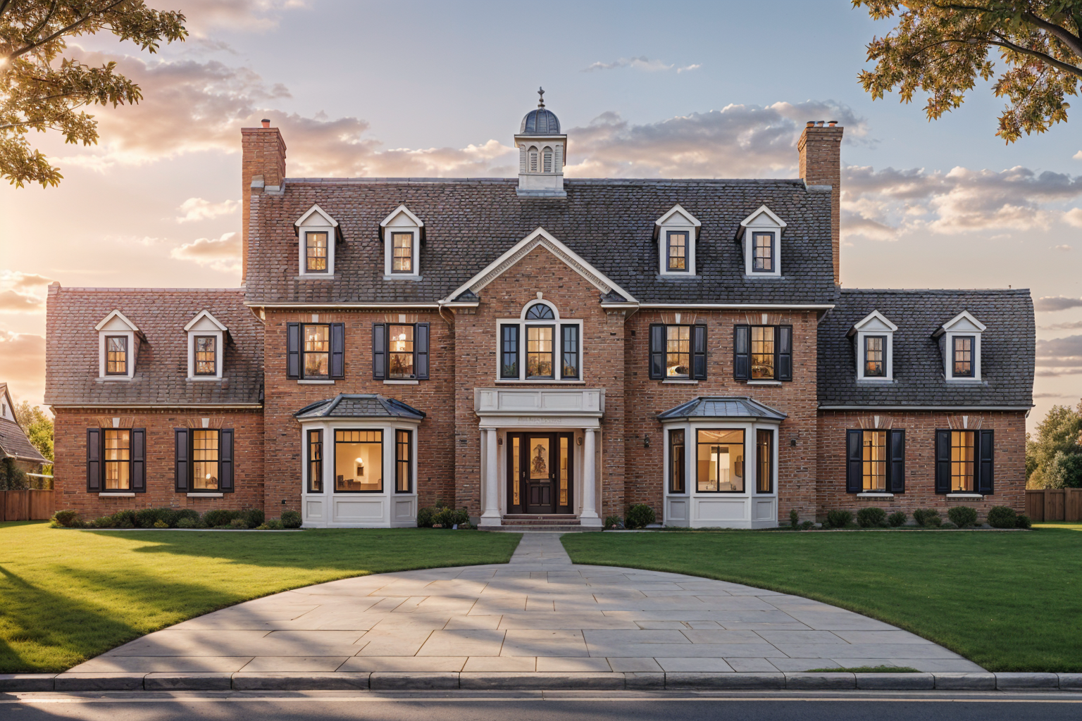 render a charming countryside home with a rustic yet modern design the main building is coated in a warm earthy gray with accents of dark brown and dark brown horizontal siding the roof is a standing seam metal charcoal gray the stone texture on the side panels is a mix of light grau and dark gray a warm inviting glow comes from the windows suggesting a cozy interior complemented by a soft sunset sky with hues of orange and pink surround the house with lush greenery tall trees in vibrant green and a path leading to the door with lavender bushes make the atmosphere serene and welcoming architecture