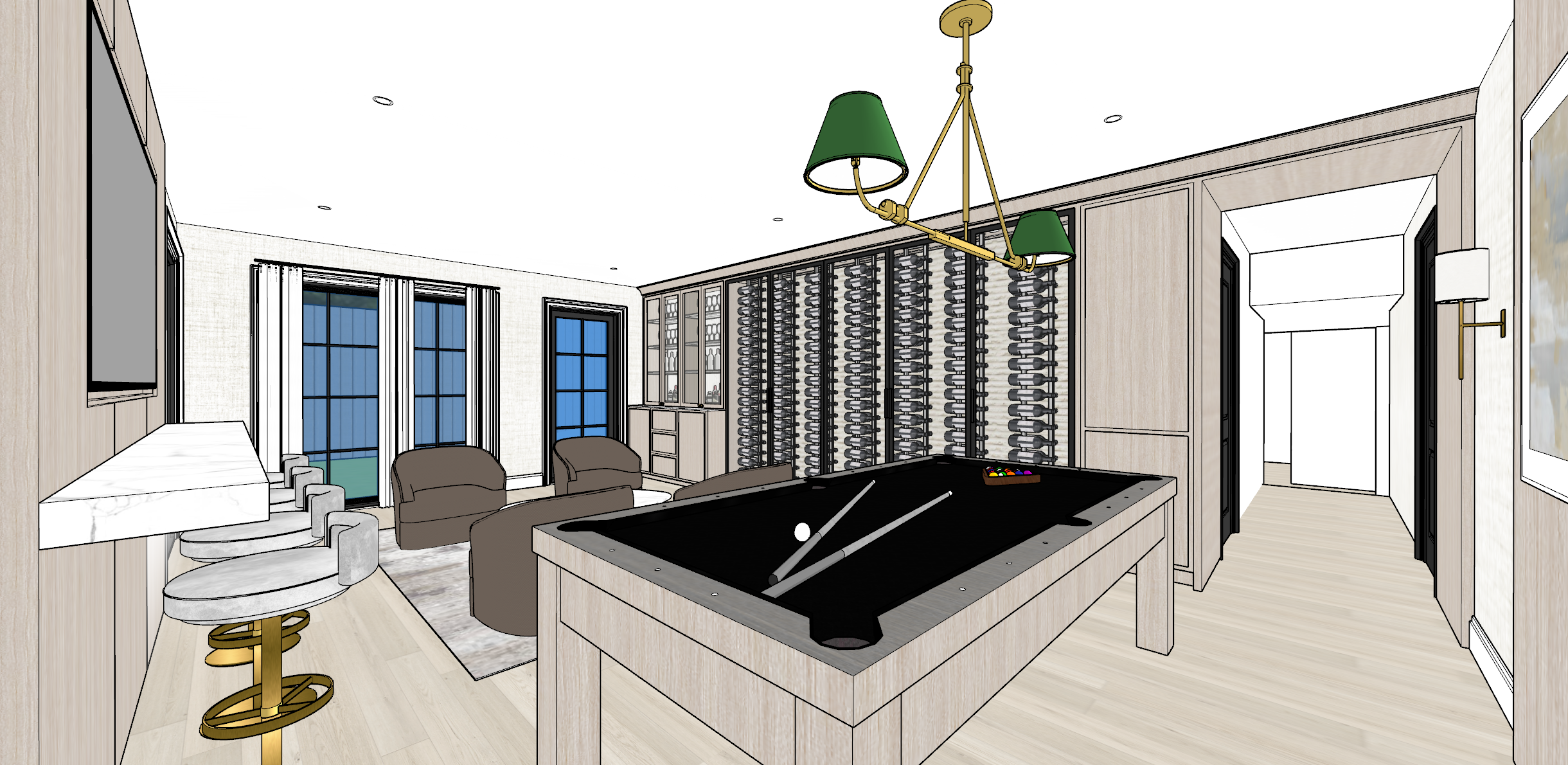 turn image to realistic photo light up wine display behind glass chiseled limestone behind wine racks turn on all recessed lights and pendants all cabinetry is light oak finish