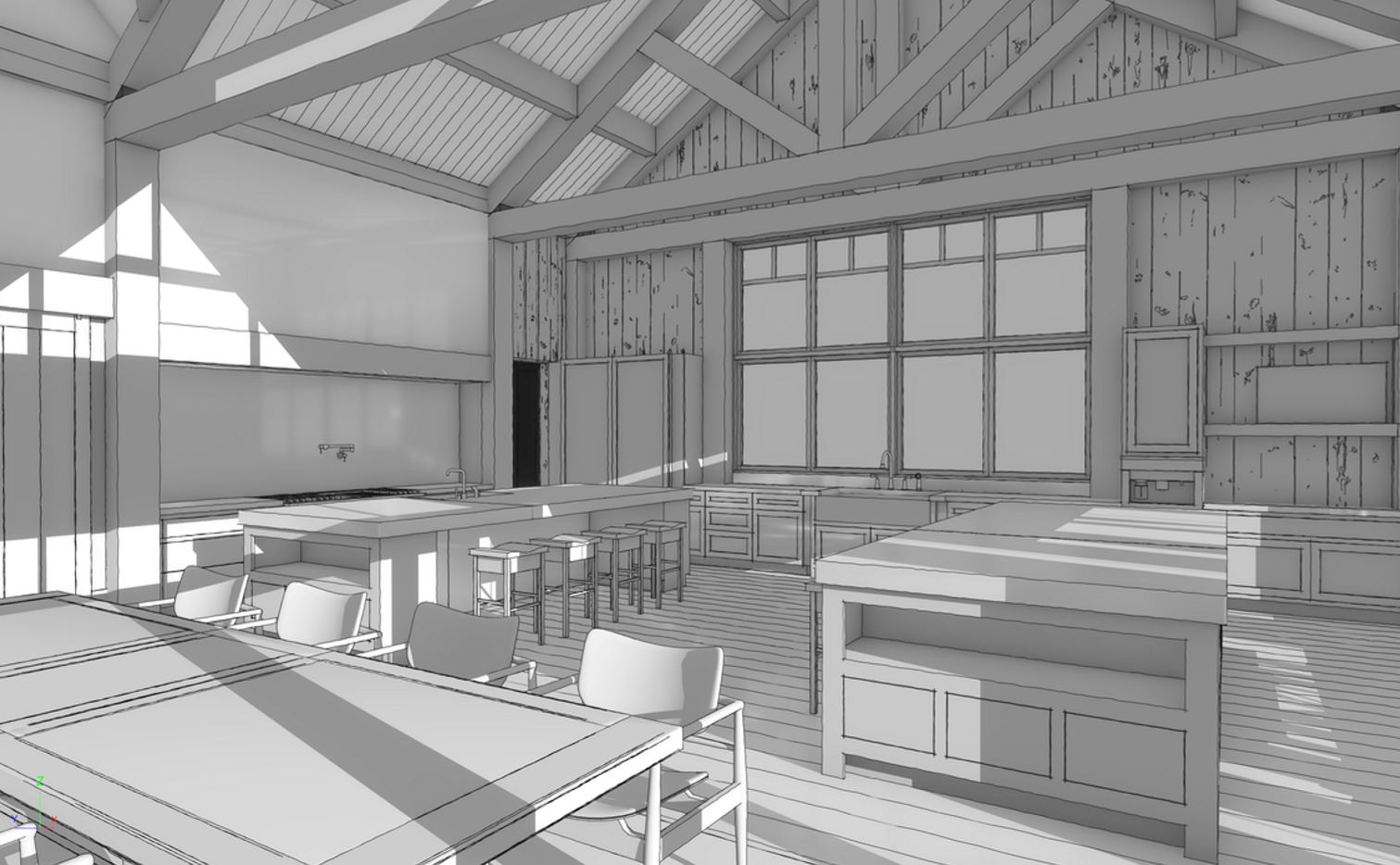 exterior shot rustic wooden modern black metal window frame stone countertop wooden floor forest behind window kitchen cabinet rustic wood