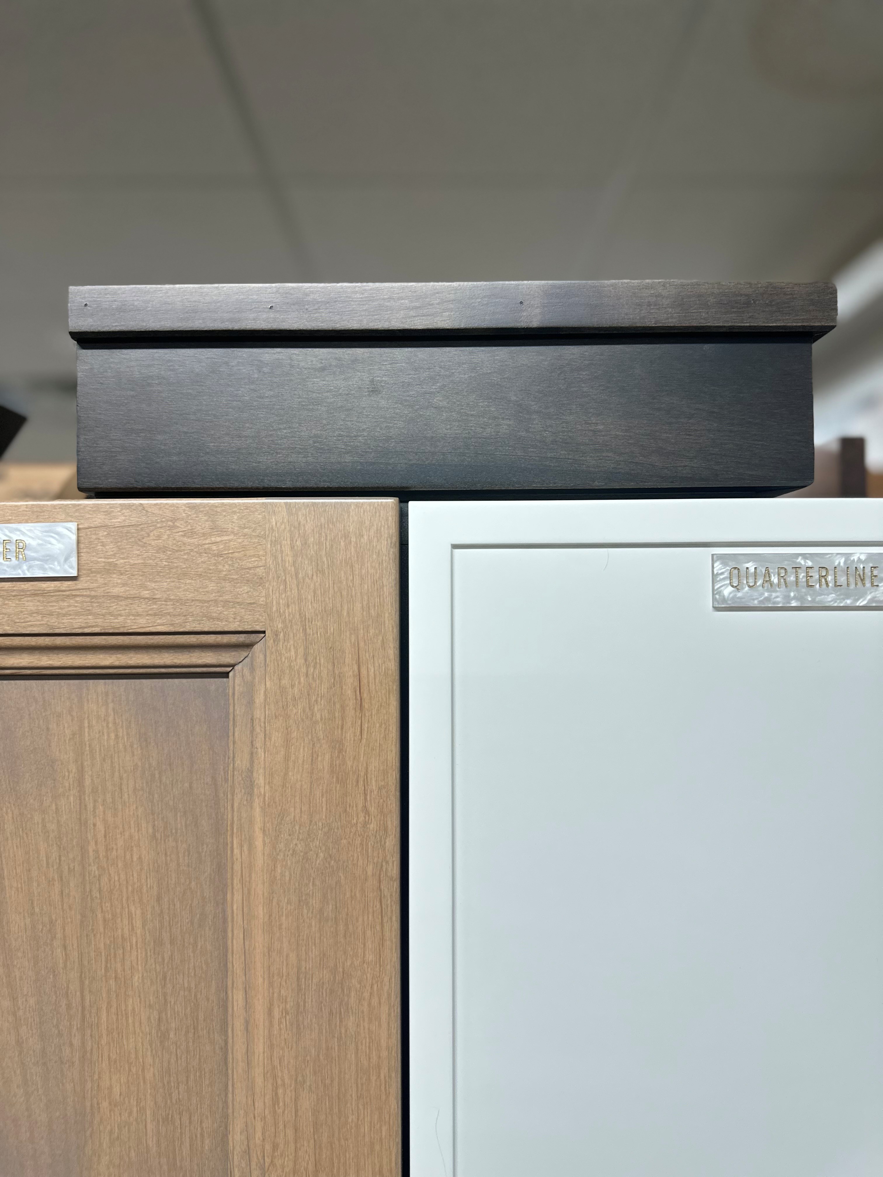 add natural light make the dark crown molding match the same color as the cabinet door on the left and then make it into a standalone upper cabinet with drywall behind it