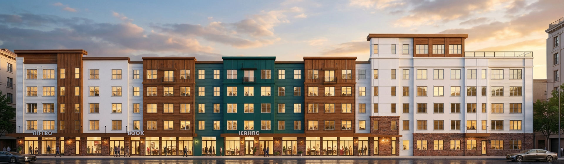 do not touch anything on the first floor on the second third fourth and fifth floors mix different variations of white brown wood throughout the building make sections on both ends right and left be dark teal create some symetry with the brown wood and white