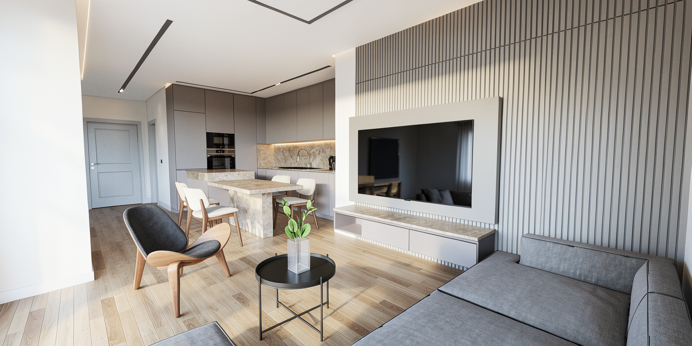 pale birch timber veneer cupboards sydney cbd skyline solid white wall on right hand side include windows in distance