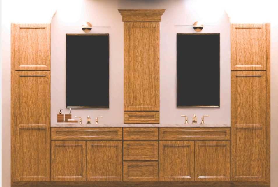 perspective shot make the mirrors look like mirros and add the same crown that is in the middle to the left and right cabinets add door handle to the upper right door and the lower left and right door