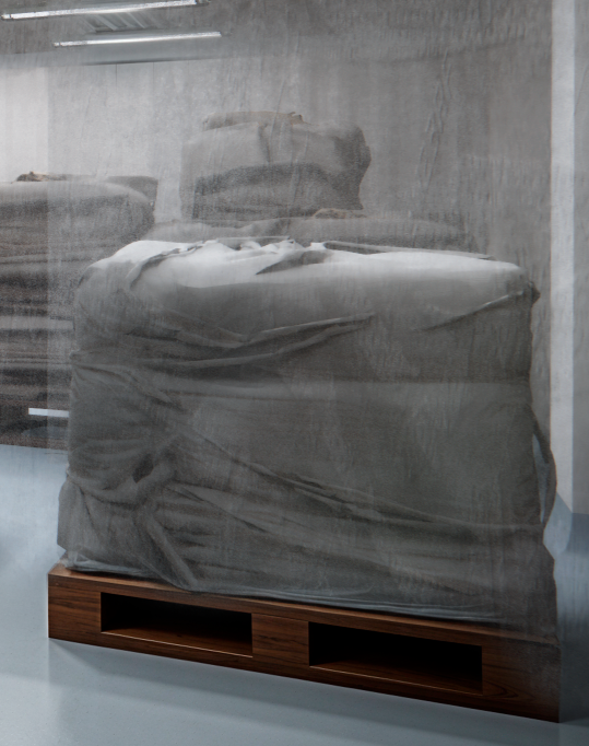 a large interior of a refrigerator camera there is a pallet base with a bundle of fruit sacks wrapped in transparent plastic shrink wrap