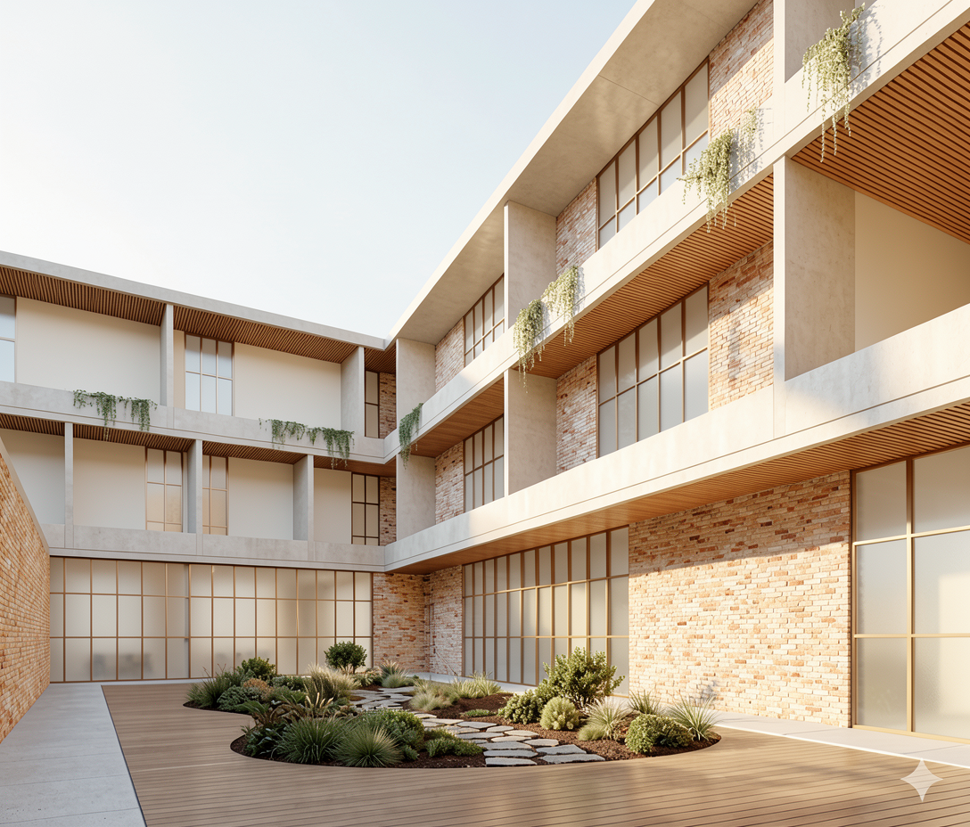 strictly preserve the original image exact same camera angle exact same composition preserve all architectural elements no changes to structure no modifications to walls doors or openings keep all furniture exactly as is do not add or remove any objects do not redesign anything preserve original materials and colors no reinterpretation no deformation no new elements enhance only lighting and realism photorealistic rendering warm minimalist interior soft diffuse natural light end of afternoon architectural photography preserve exact geometry and furniture no changes to layout no new objects calm composition natural materials with subtle variation slightly desaturated tones soft shadows no harsh contrast 50mm lens shallow depth of field slight film grain generate an outdoor background only where there is an original horizon in the sketchup image with fields typical of the alsatian sundgau region soft subtle imperfections natural material texture variation slightly patinated tables surfaces only soft and warm lighting in the pendant lighting