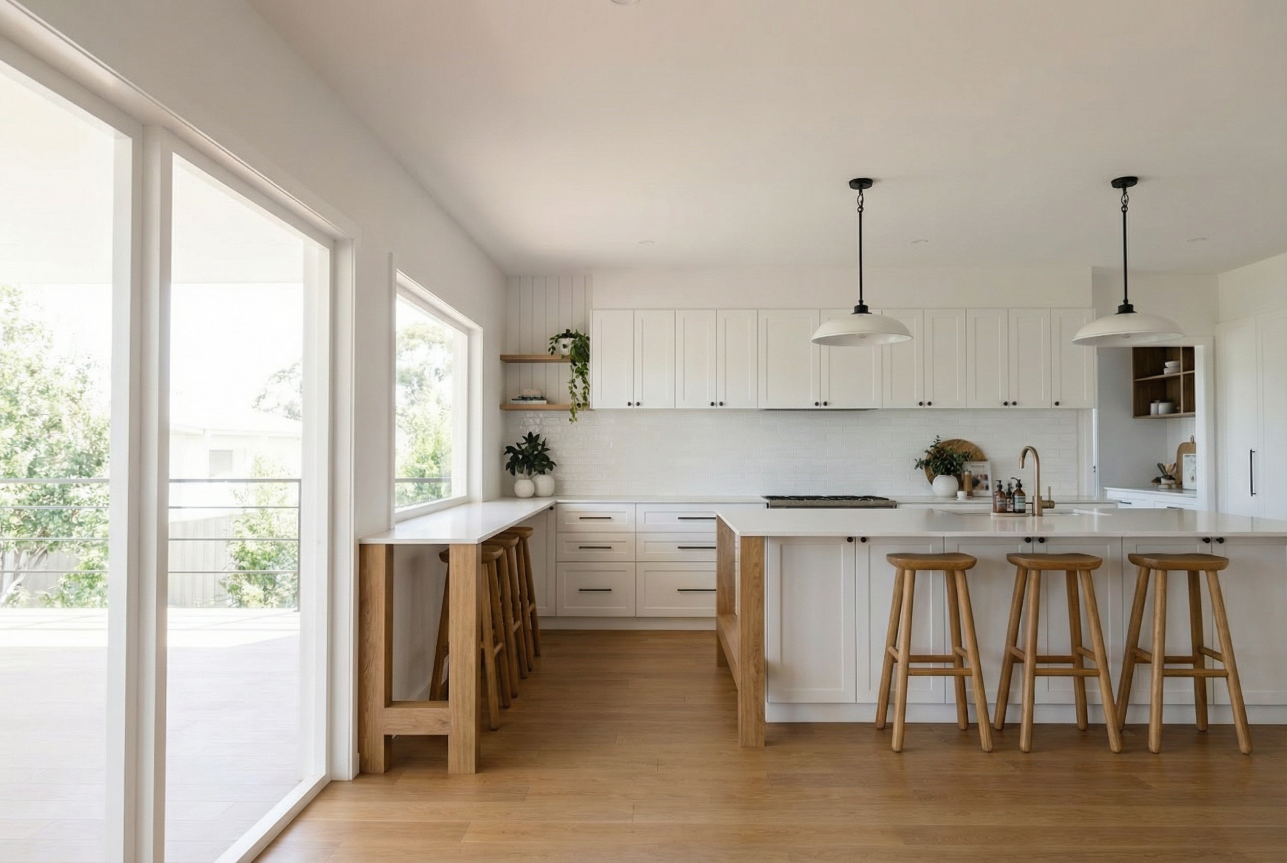 genau dieses rendering berarbeiten fotorealistisches innenraum foto exakt dieselbe perspektive und kameraposition wie das hochgeladene referenzbild 100 identische raumgeometrie exakt gleiche m belanordnung exakt gleiche verlegeart und richtung von parket wie vorlage exakt identische fensterpositionen mit gleichem ausblick durch die fenster weiches nat rliches tageslicht leicht schr g einfallende sonne durch die grossen fenster geschlossene r ume k nstlich ausleuchten sanfte realistische schatten blickrichtung ist nach osten sonnenlicht kommt von s den realistische materialien echte holztexturen stoff mit leichten gebrauchsspuren hochwertige oberfl chenreflexionen kleine gr npflanzen am boden lavabo aus marmor collemandina grigio in braungrau dunkel dahinter je eine vola standarmatur fs2 edelstahl links hinten bei den lavabos hat es einen schrank f r badet cher schrankfronten alle grauglas gl nzend ohne griffe parket ruhig und hellgrau vollkommen rahmenloser und hinterleuchteter spiegel 140 cm durchmesser hinter den lavabos ist die nicht sichtbare dusche hell ausgeleuchtet badewanne aus glas dunkelgrau transluzent dahinter eine standarmatur vola fs1 alle sichtbaren w nde sind sichtbeton leichter tagesvorhang in graubeige auf der rechten seite des fensters runde filigrane schwarze einbauspots vor der fensterfront sehr moderner minimalistischer look menschen mit echten menschen im freizeitlook ersetzen nat rliche farbwiedergabe das bild muss wie eine professionelle fotografie aussehen es soll ein echtes und reales foto sein canon eos r5 35 mm festbrennweite f 2 8 hyperrealistisch dslr qualit t raw aufnahme 8k aufl sung extrem scharf perfekte tiefensch rfe professionelle architekturfotografie