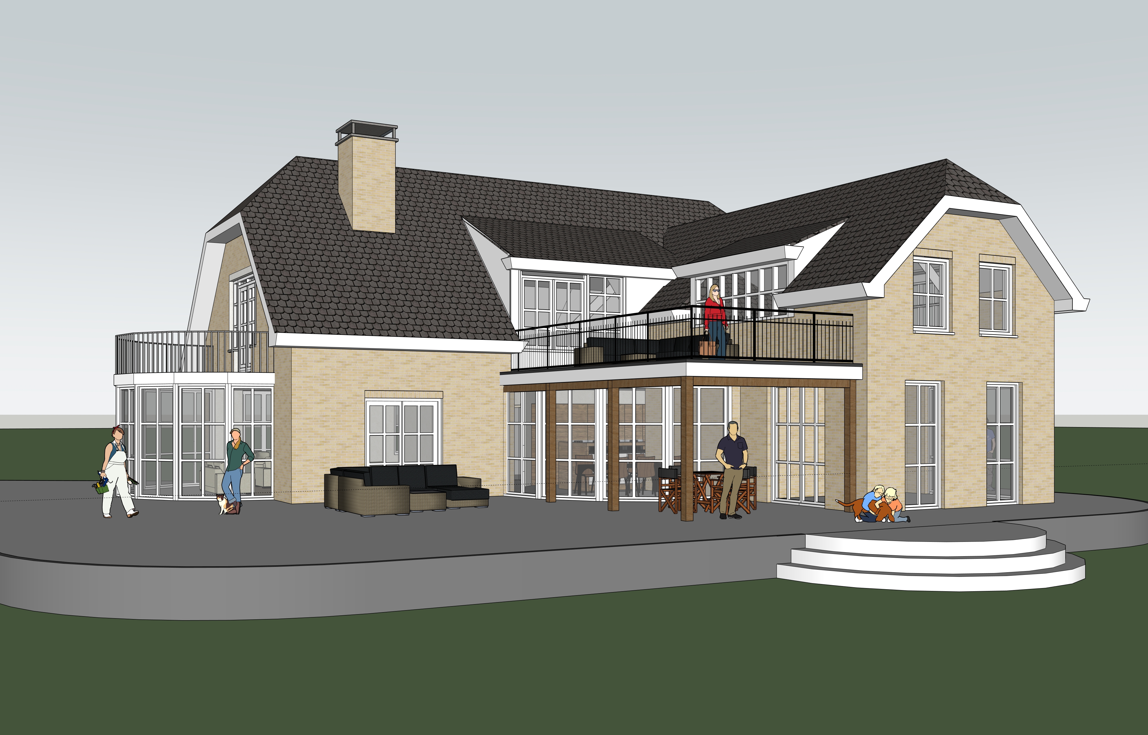 the house in the scene is surrounded by a lush green garden with lots of flowers and bushes the terrace is tiled with big tiles and there are people and plants in pots and terrace furniture on it there are lots of people in the scene the weather is sunny with a few clouds in the sky