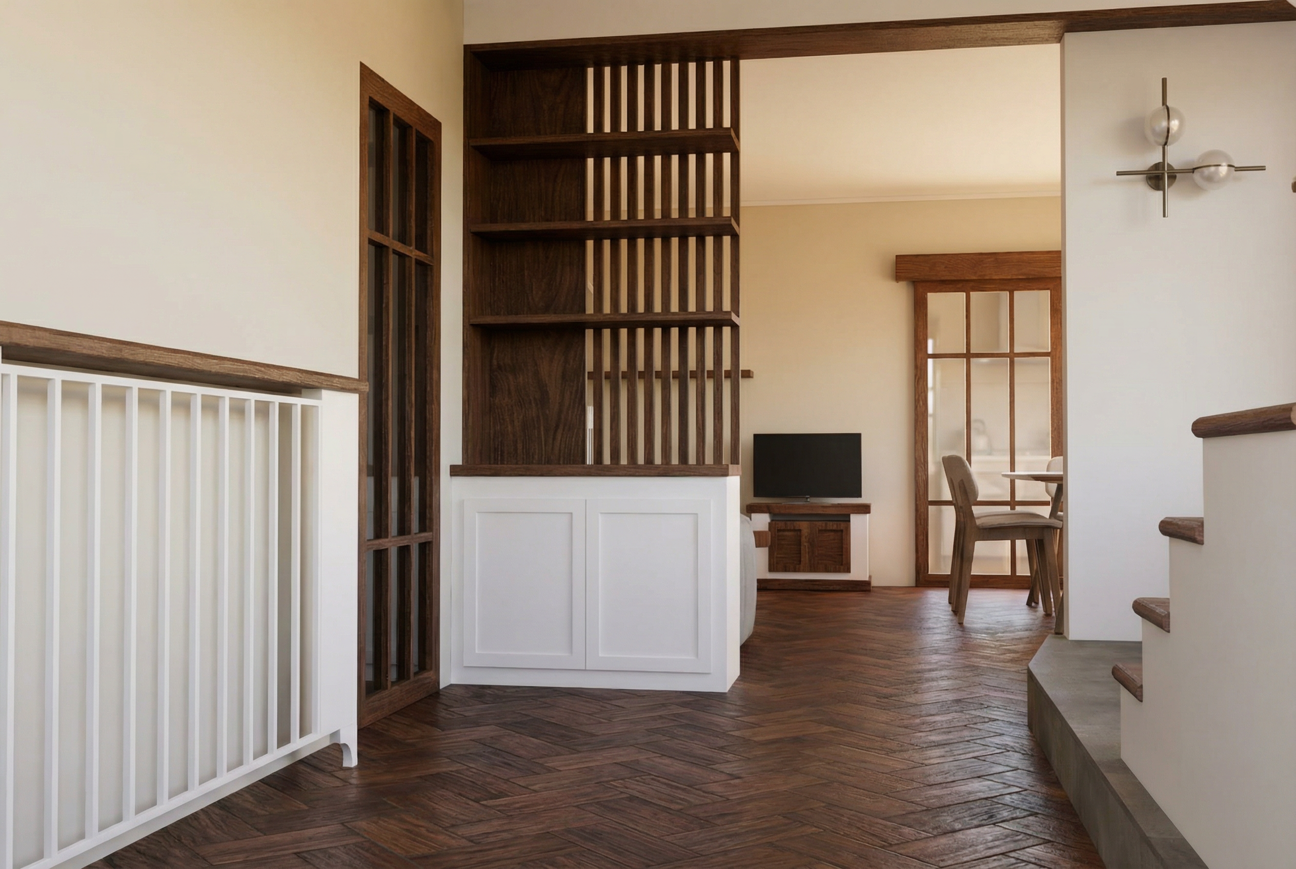 ultra photorealistic poetic editorial bathroom interior front view of a modern vanity wall with glossy oval ceramic tiles with subtle thickness beveled edges and realistic depth slightly recessed red grout with soft shadows dark walnut floating cabinet and matching walnut shelf under the mirror white integrated sink with minimalist chrome faucet rectangular mirror with thin garnet steel frame semi opaque glowing spherical wall lamp on garnet metal plate red and white striped towel hanging on the side soft natural daylight from the right creating tile relief shadows warm ambient lighting high end interior magazine photography cinematic composition ultra detailed textures realistic materials 8k sharp focus no people no text no logos