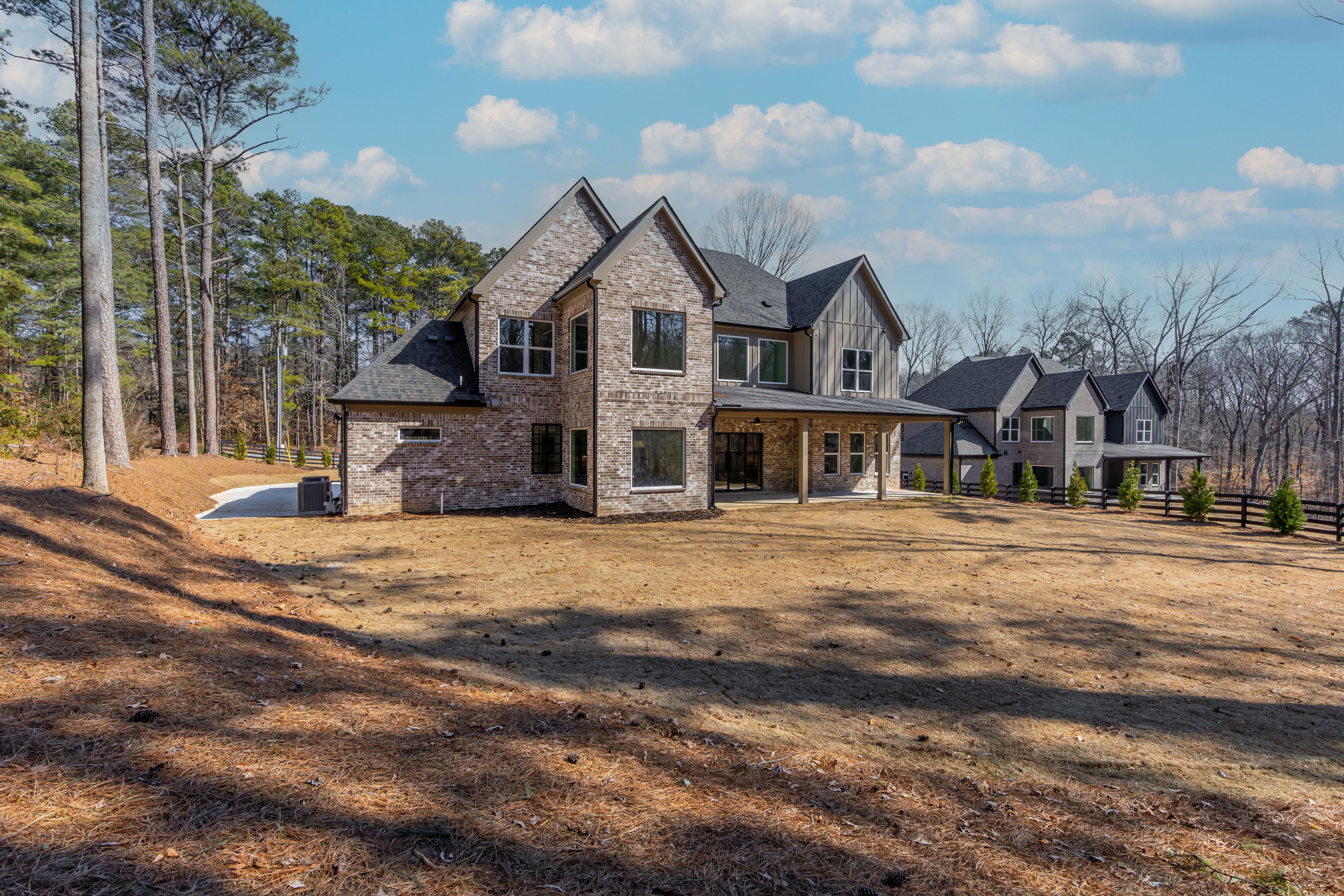 a manicured lawn layered flower beds low maintenance shrubs native plants stone pathway leading to the entrance add a pool with hot tub and chairs
