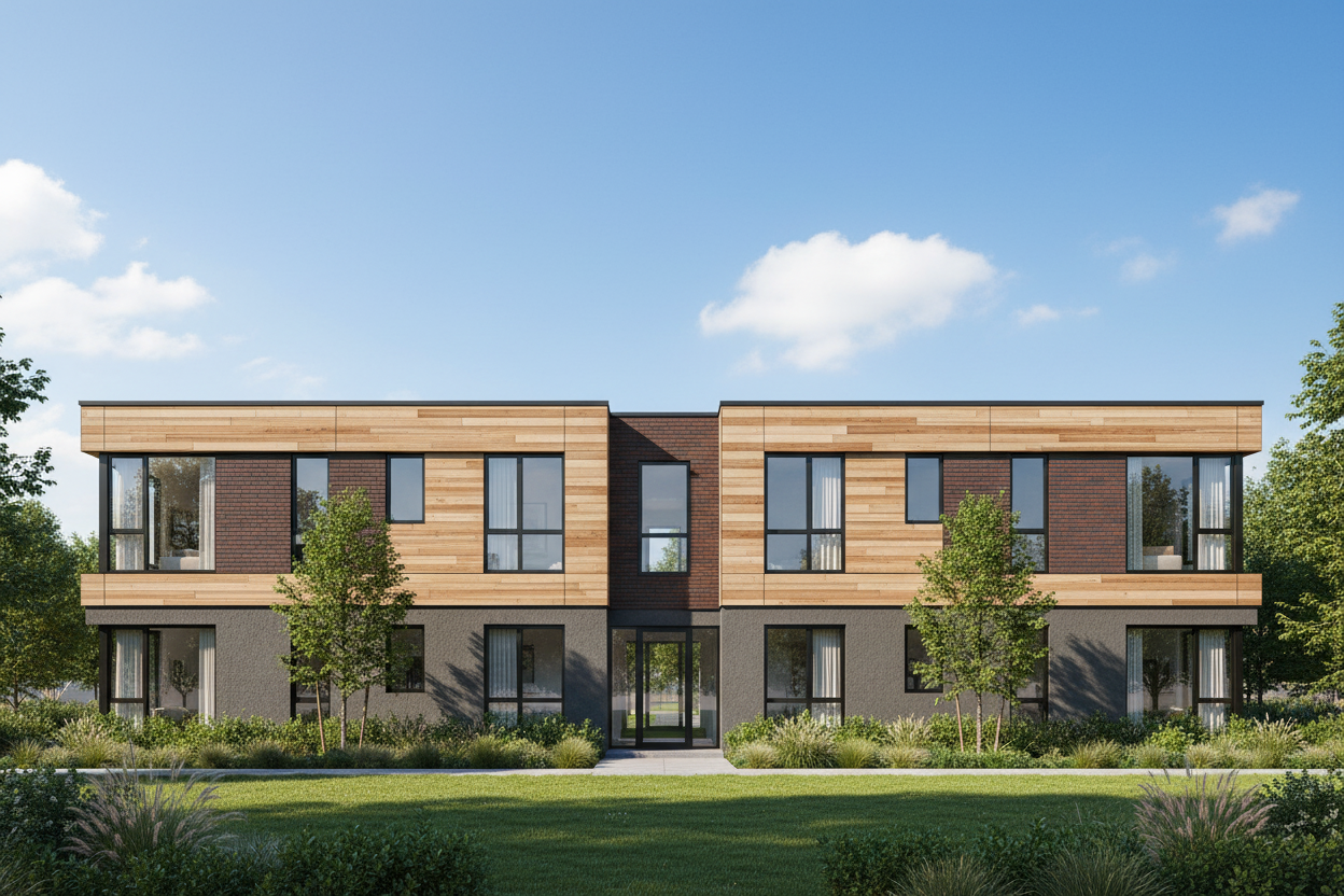 a modern building facade with a row of uniformly arranged windows each framed by black lines the building s structure is a mix of wood stucco and metal it is warm feeling welcoming and professional