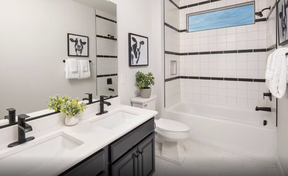 remove the artwork from the wall including the mirror reflection of the cow remove the lines from the shower wall make sink cabinets a stained deep brown instead of black