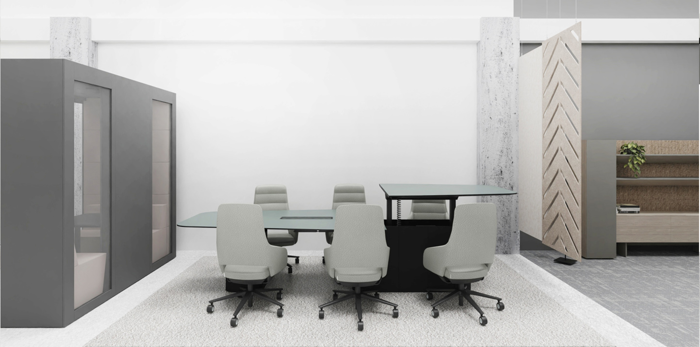 make it look photorealistic cieling is dark concrete with indusrtial style visible comunnications put some intensive artificial spotlights falling from the cieling on chairs and desk in the front the space is light and well illuminated add few standing people around the table