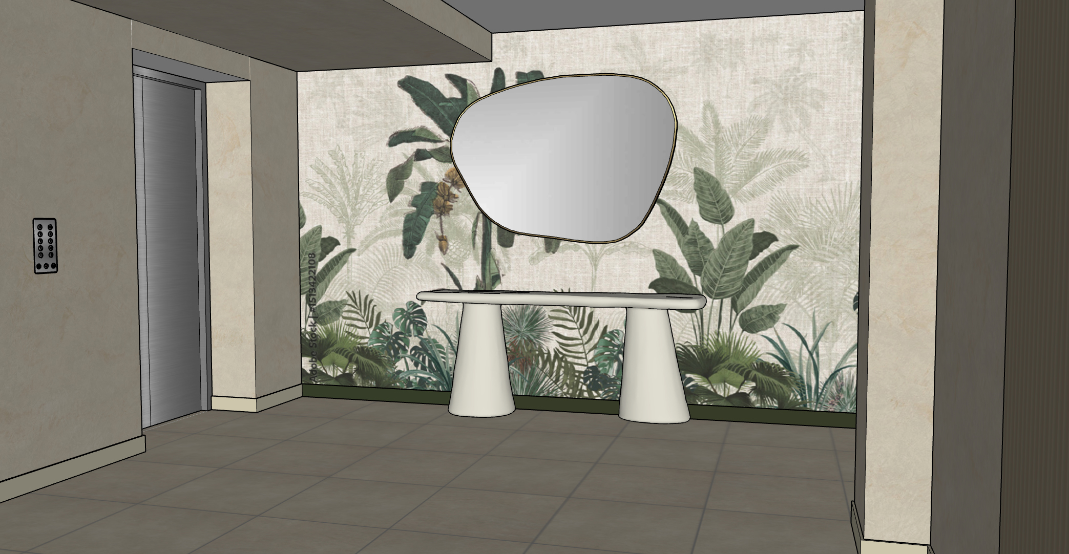 add photorealism while keeping your colors and materials unchanged add warm lighting creating a soft foyer atmosphere warm ambient lighting keep interior light and bright ensure pendant lights are retained in shape and ensure the curtains are semi translucent to imitate sheer curtains