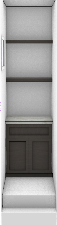 make this into a realistic rendering the box on the wall on the left is a small window window has white frame the cabinets and shelfs are black painted shaker doors with wood texture the two steps in the front floor is oak wood
