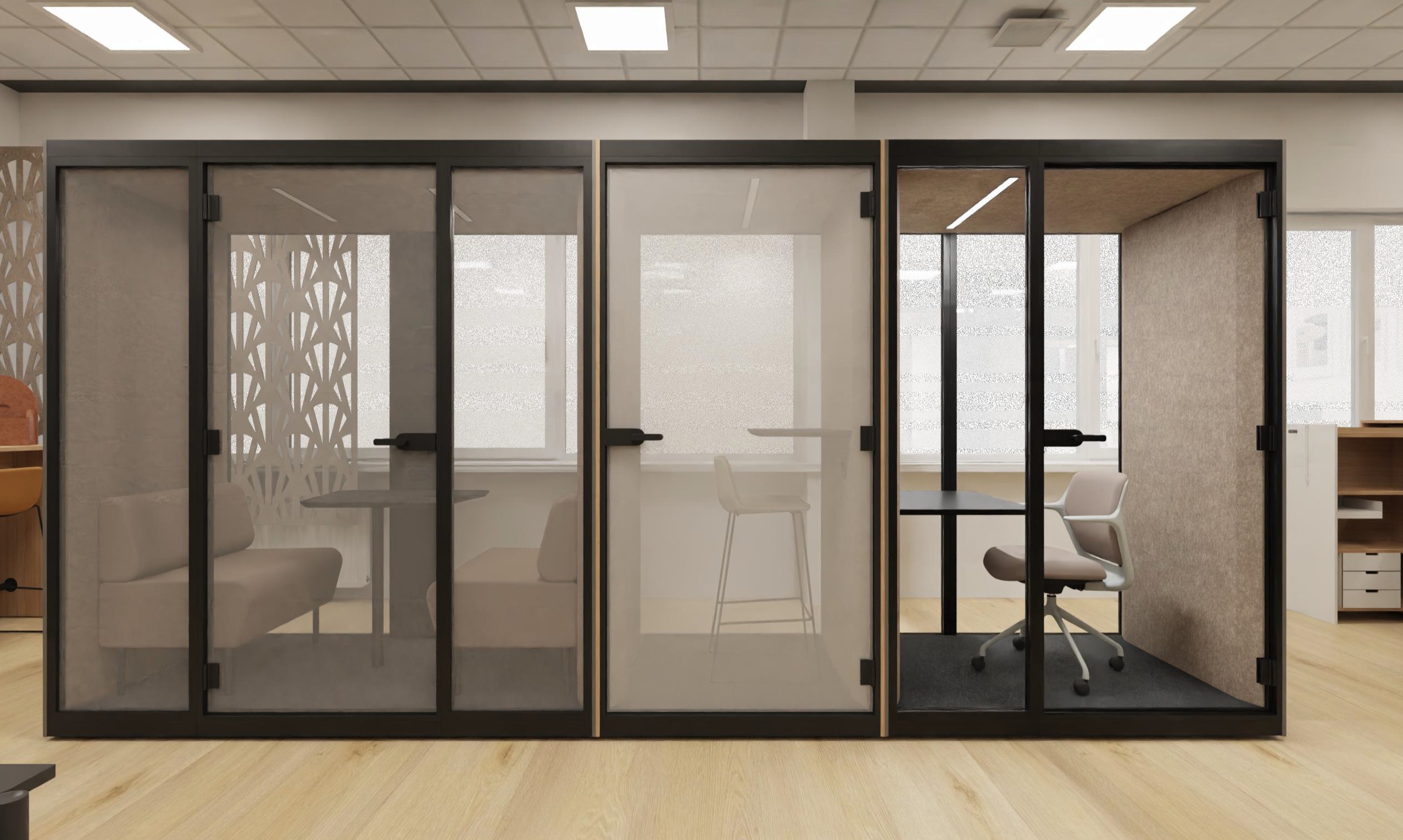 make this look photorealistic there needs to be 2 people in the left pod meeting there needs to be one person in the middle pod talking on the phone there needs to be one person in the right pod working with the laptop keep original colors