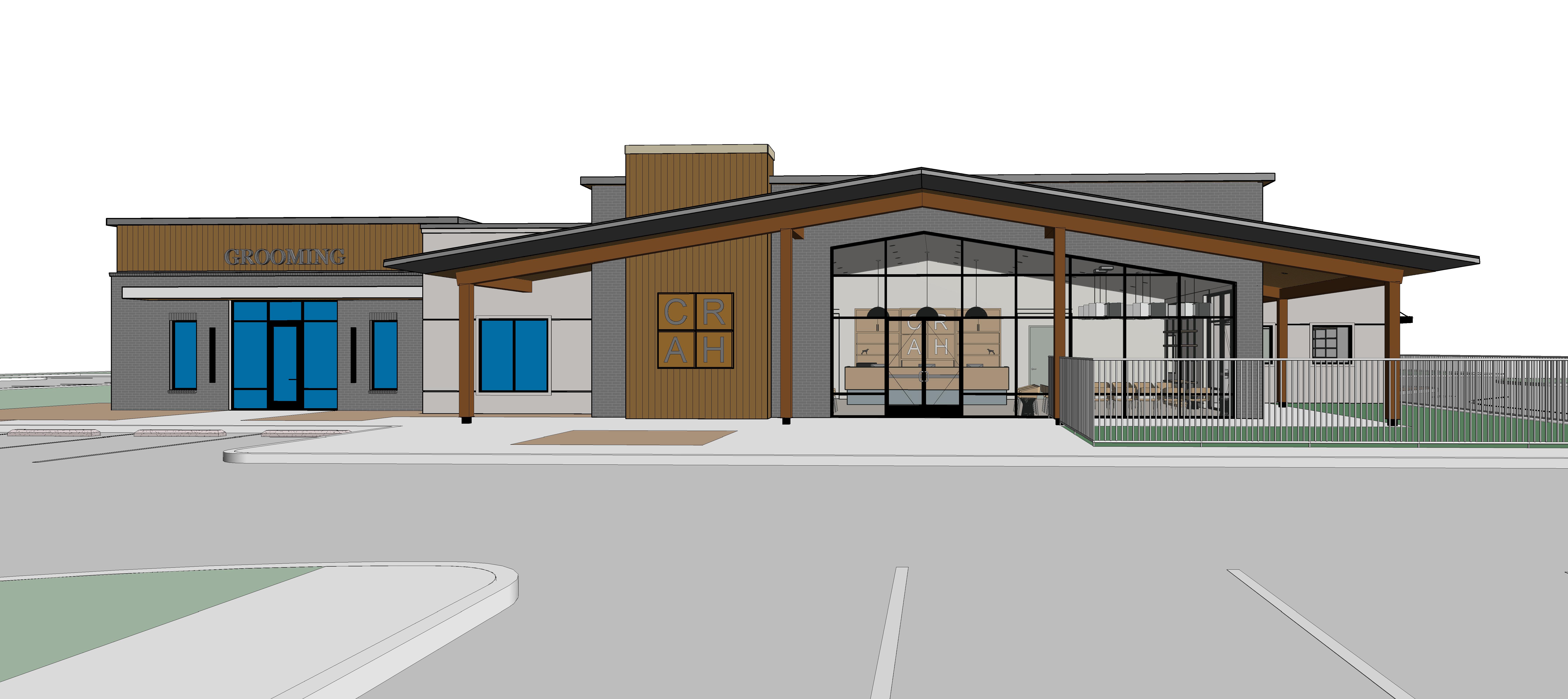 render with a car parked on the left side add a couple walking their dog to the front door add a man standing with his dog in the yard to the right add realism make photorealistic