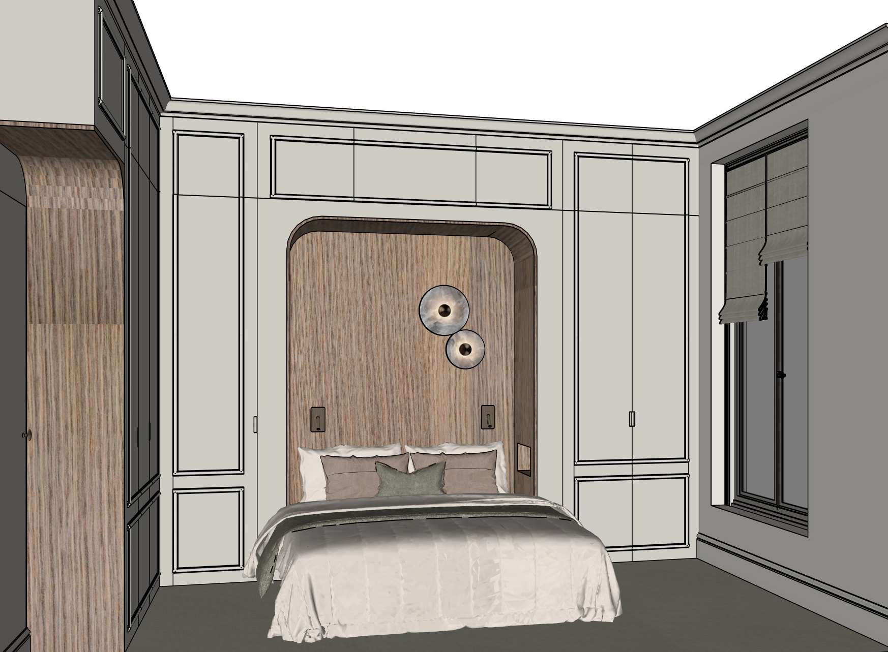 the apartment is on the 3rd floor of a parisian building the millwork is in farrow and ball ammonite https www farrow ball com fr peinture ammonite the walls are in light greige the sconces are apparatus studio median model https apparatusstudio com products median sconce variant 42444219678783