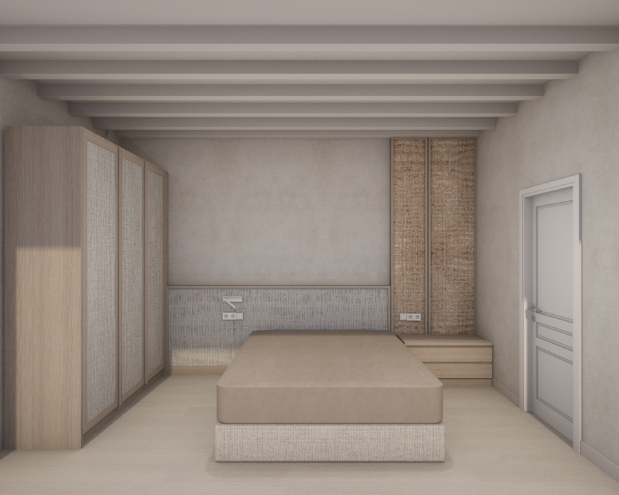 create a highly realistic render of an interior bedroom with a calm and serene atmosphere the headboard is upholstered in a light beige linen fabric creating a soft and elegant focal point on the right side the tall headboard section features a luxurious rattan texture create a realistic and professional render of a bedroom with a calm and atmospheric mood the lighting should feel balanced and natural enhancing the realism of the materials the bed is dressed with linen sheets and a coverlet in earthy tones with character the bedding palette includes broken white and beige linen fabrics while the coverlet is a beige linen tone adding subtle depth and contrast the fabrics look high quality refined and luxurious ultra realistic render high resolution professional interior design photography style keep the design exactly as it is